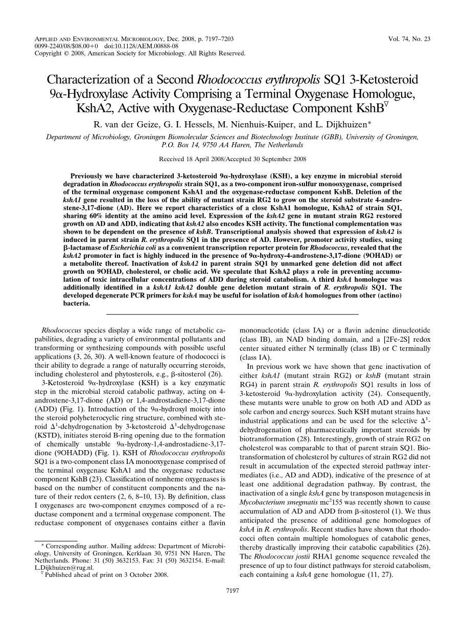 界定红球菌SQ13-酮类固醇9α-羟化酶活性包括末端加氧酶同源物KshA2活性与氧化还原酶组分KshB外文翻译资料