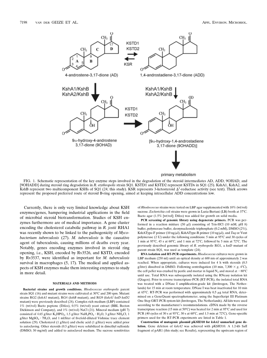 在先前的工作中,我们已经显示亲本菌株红平红球菌SQ1中kshA1(突变菌株RG2)或kshB(突变菌株RG4)的基因失活导致3-酮类固醇9alpha;-羟基化活性的丧失。因此,这些突变体不能作为唯一的碳和能源在AD和ADD上生长。这种KSH突变菌株具有工业应用,可用于通过生物转化选择性1 - 药学上重要的类固醇的脱氢。有趣的是,菌株RG2对胆固醇的生长与亲本菌株SQ1的生长相当。菌株RG2的培养物对胆固醇的生物转化不会导致预期的类固醇途径中间体(即AD和ADD)的积累,表明存在至少一种另外的降解途径。相比之下,最近显示通过耻垢分枝杆菌mc2155中的转座子诱变使单个kshA基因失活导致13-谷甾醇中AD和ADD的积累。因此,我们预测在红平红球菌中存在另外的kshA基因同源物。最近的研究表明,rhodo-cocci通常含有多个分解代谢基因的同源物,从而大大提高了它们的分解代谢能力。Rhodococcus jostii RHA1基因组序列显示存在多达四种不同的类固醇分解代谢途径,每种途径含有kshA基因同源物。