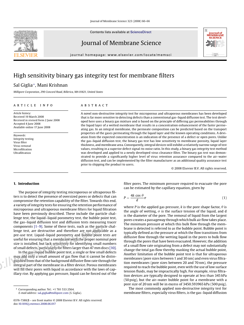 已经开发出一种用于微孔和超多孔膜的新型非破坏性完整性测试,与传统的气液扩散试验相比,它对检测缺陷更加敏感。测试开发中使用二元气体混合物,并且基于不同的气体渗透性原理,湿润膜的液体层导致二元气体浓度增加,渗透速度更快。在整体膜中,可以基于渗透通过液体层的气体的性质和已知的操作运输条件来预测渗透物的组成成分。与预期浓度的偏差表明存在缺陷或开孔。与气液扩散试验不同,二元气体试验对膜孔隙率,液层厚度和膜面积的敏感性较低。因此,整体器件将表现出相对窄的测试值范围,从而产生优异的缺陷信噪比。在这项研究中,开发了二元气体完整性测试方法并应用于新开发的病毒清除过滤器。与空气 - 水扩散测试相比,二元气体测试被证明提供了显着更高水平的病毒保留保证,并且可以在将产品运送给用户之前由过滤器制造商实施作为额外的质量保证测试。