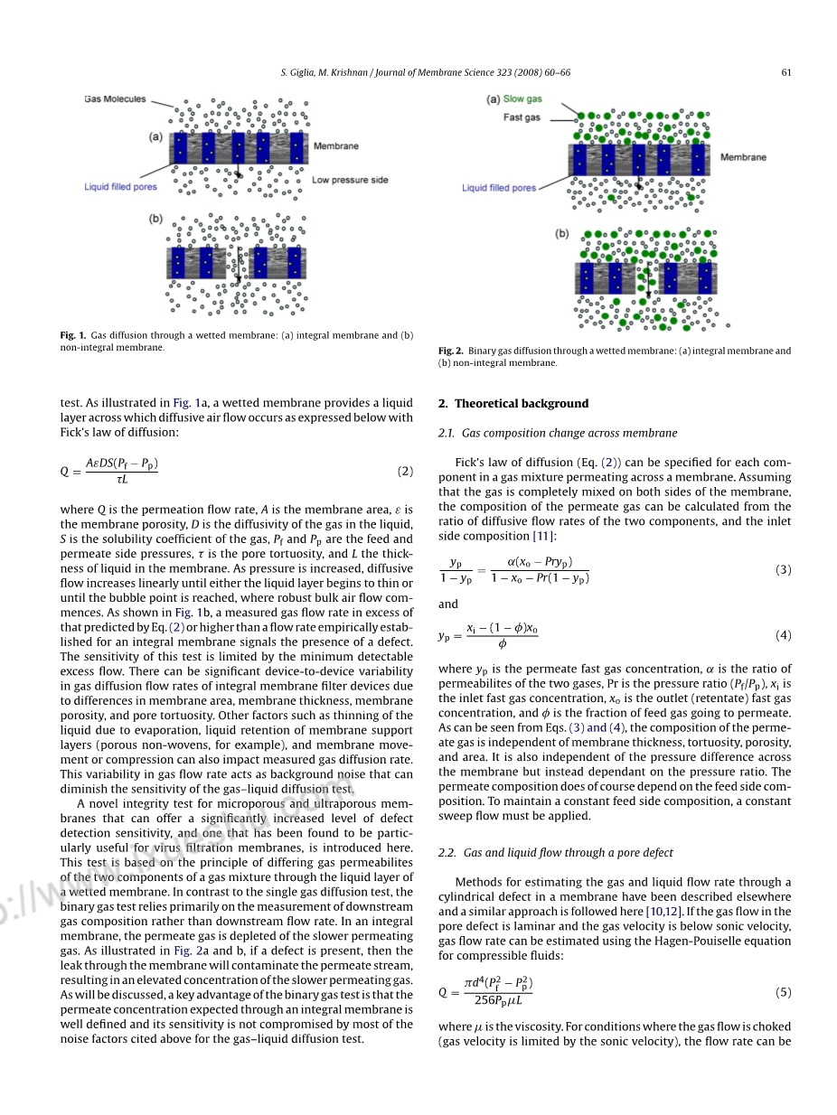 本文介绍了一种新型的微孔和超多孔膜完整性测试,该测试可显著提高的缺陷检测灵敏度,并且已被发现对病毒过滤膜特别有用。该试验基于通过湿膜的液体层的气体混合物的两种组分的不同气体渗透性的原理。与单一气体扩散测试相反,二元气体测试主要依赖于下游气体成分的测量而不是下游流速。在整体膜中,渗透气体耗尽较慢的渗透气体。如图2a和b所示,如果存在缺陷,那么通过膜的泄漏将污染渗透物流,导致较慢渗透气体的浓度升高。如将讨论的,二元气体测试的关键优点是通过整体膜预期的渗透物浓度被很好地限定,并且其灵敏度不受上面引用的用于气 - 液扩散测试的大多数噪声因子的影响。