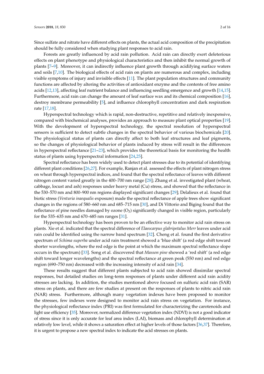 这些结果表明,遭受酸雨的不同植物表现出不同的光谱响应,但缺乏对不同酸雨酸度胁迫下植物长期响应的详细研究。此外,上述研究的重点是对植物的硫酸雨(SAR)胁迫,目前关于植物对硝酸雨(NAR)胁迫的反应的研究很少。此外,尽管已经提出了许多植被指数来监测应力,但很少有指标用于监测植被的酸雨胁迫。例如,生理反射指数(PRI)首先用于表征类胡萝卜素和光利用效率[35]. 此外,归一化差异植被指数(NDVI)不是一个很好的应力指标,因为它只对叶面积指数(LAI),生物量和叶绿素测定在较低水平上是准确的,而在这些因子的较高水平上则表现出饱和效应 [36,37].因此,迫切需要提出一种新的光谱指数来指示植物的酸胁迫。
