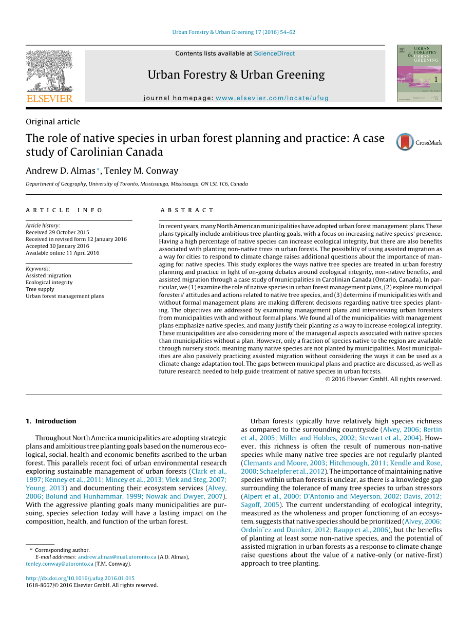 最近的城市生态学和城市林业文献辩论了城市中本地树木的价值,部分原因是与城市森林有关的独特概念(Hitchmough,2011年;Kendle和Rose,2000年;Kowarik,1995年;Rotherman和Lambert,2013年).特别已经讨论了实现生态完整性的重要性和潜在途径、种植非本地树木的有益作用以及利用协助迁移作为缓解和适应气候的工具(Camacho,2010年;Davis,2012年;Hewitt等人,2011年;Ordoıntilde;ez和Duinker,2014年;Zhu等人,2012年).