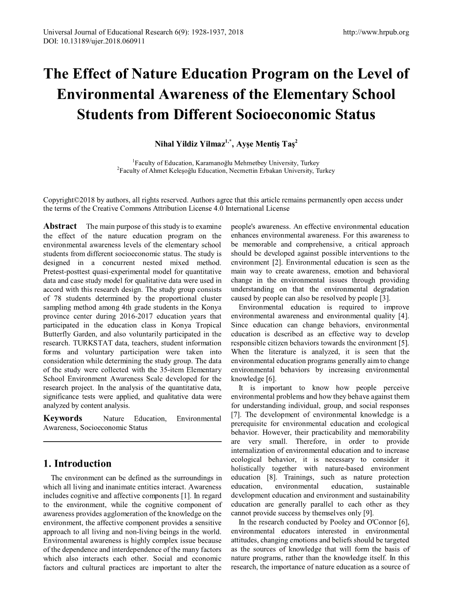 摘要 这项研究的主要目的是检验自然教育计划对不同社会经济地位的小学生环境意识水平的影响。该研究是在并行嵌套混合方法中设计的。根据本研究设计,采用定量数据的前测后测准实验模型和定性数据的案例研究模型。研究小组由78名学生组成,他们是在2016-2017教育年科尼亚省中心四年级学生中,按比例整群抽样法确定的,这些学生参加了科尼亚热带蝴蝶园的教育班,并自愿参加了研究。在确定研究组时,要考虑TURKSTAT数据,教师,硕士的学生信息和自愿参加。这项研究的数据是使用为研究项目开发的35项小学环境意识量表收集的。在定量数据分析中,应用了显着性检验,并通过内容分析对定性数据进行了分析。