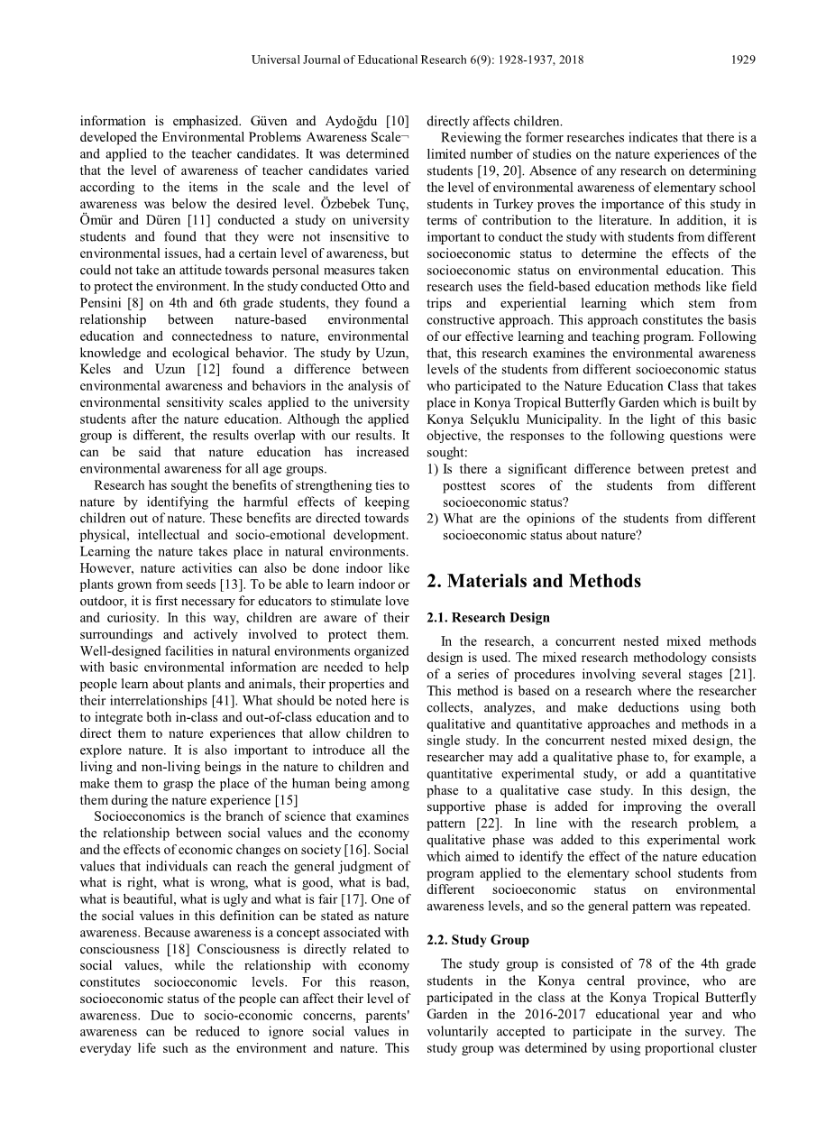 回顾以前的研究表明,关于学生的自然经历的研究数量有限[19,20]。土耳其没有任何关于确定小学生环境意识水平的研究,从文献贡献的角度证明了这项研究的重要性。此外,重要的是与来自不同社会经济地位的学生进行研究,以确定社会经济地位对环境教育的影响。这项研究使用了基于建构主义方法的基于实地的教育方法,例如实地考察和体验式学习。这种方法构成了我们有效的学与教的计划的基础。此后,本研究考察了参加不同活动的学生的环境意识水平,这些学生参加了由Konya Selccedil;uklu市政府建造的Konya热带蝴蝶园举办的自然教育班。根据这一基本目标,寻求对以下问题的答复: