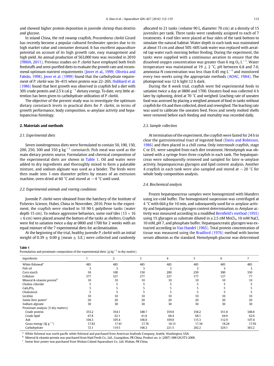 在中国内陆,红色沼虾—克氏原螯虾最近成为了一个很受欢迎的淡水养殖物种,因为这种虾有着很高的市场价值和消费需求。鉴于其具有较高的增长率,易于管理和高收益,因而具有较高的养殖潜力。2010年年产达到了563000吨。对克氏原螯虾以往研究所采用的新鲜饲料和半纯化饲料测试了生长率并推荐了最佳营养需求,Jover等人发现,当蛋白含量达到22–26%时,克氏原螯虾对碳水化合物的需求量为36–41%。Hubbard等人也发现最佳生长状态出现在用含30%粗蛋白和2.5k cal/g膳食能量日粮喂养的情况下。迄今为止,很少有人关注克氏原螯虾对碳水化合物的利用。