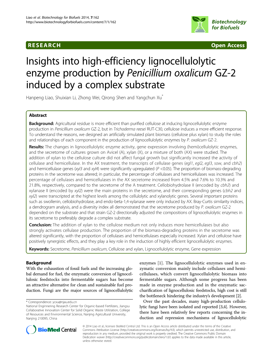 在世界范围内,农业废物是可再生且丰富的,它们可以作为廉价原料用于生产生物质降解酶。在其他地方已经报道了这些应用,这些酶将植物生物质糖化用于生产生物乙醇[12-14]。许多报道发现,许多真菌中的酶[15,16],在诱导生物量降解时,农业废物优于纯纤维素。然而,对为什么复合底物可以诱导更多的生物质降解酶,以及真菌如何在酶生产过程中与复杂木质纤维素反应的全面了解仍然缺乏。木霉属和曲霉菌的调节和分泌特征已被很好地研究和表征[17-19]。最近研究人员已经研究了真菌对植物生物量的响应,以及使用模型菌株黑曲霉的反应机制[20-22]。许多研究人员曾经调查了木霉属的分泌物和转录组。曲霉属(Aspergillus spp。)可由不同类型的植物生物诱导[10,23-26]。然而,不同真菌中酶诱导的机制显示出明显的相似性,但也表现出纤维素酶和半纤维素酶编码基因表达调节的差异[27]。在以前的研究中,农业废弃物诱导的木质纤维素分解酶活性显着高于草酸青霉菌GZ-2纯化纤维素诱导的酶活性。然而,这个特征在里氏木霉RUT-C30菌株中不存在(数据未发表在我们的实验室中),表明草酸青霉素GZ-2可能具有不同的调节机制和产生木素分解酶的诱导机制。
