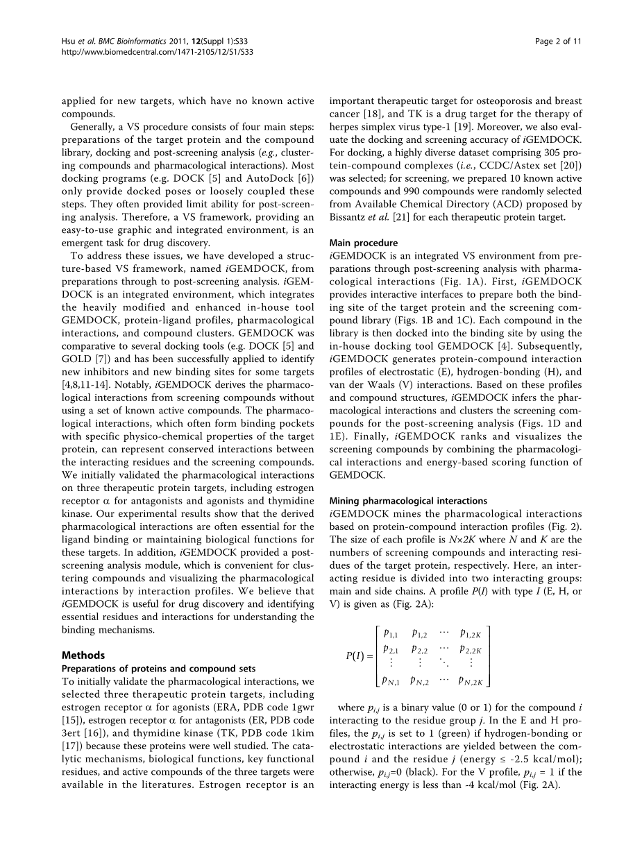 为了解决上述的这些问题,我们开发了一个名为iGEMDOCK的软件,它是一个基于结构的虚拟筛选程序,包含了从准备阶段到晒筛选后分析的所有过程。iGEMDOCK是一个综合的环境,它包含了善于修改和增强的内部工具GEMDOCK,蛋白质-配体谱、药理学作用机制和化合物家族。和几种对接工具相比,GEMDOCK已经在筛选靶标的新抑制剂和结合位点上取的了成功的应用。值得注意的是iGEMDOCK是在未使用任何一组已知活性化合物的情况下,从待筛选的化合物中发现药理学的作用机制的。一般情况下,在目标蛋白的特定物理化学性质的结合部位产生的药理学作用机制可以表明作用残基和筛选的化合物之间作用的稳定性。最初我们验证了三种治疗性靶蛋白的药理学作用机制,这其中包括了激动型雌性激素受体alpha;、拮抗型雌性激素受体alpha;和胸苷激酶。实验结果表明,对于配体结合或者维持这些靶标的生物学功能,这些衍生的药理学作用机制是非常重要的。重要的是,iGEMDOCK提供了一个后期分析的模块,这使得聚集化合物和药物作用的相互作用的分析更为方便。我们相信iGEMDOCK对于发现药物和识别与结合机制相关的必需残基和相互作用是有效的。