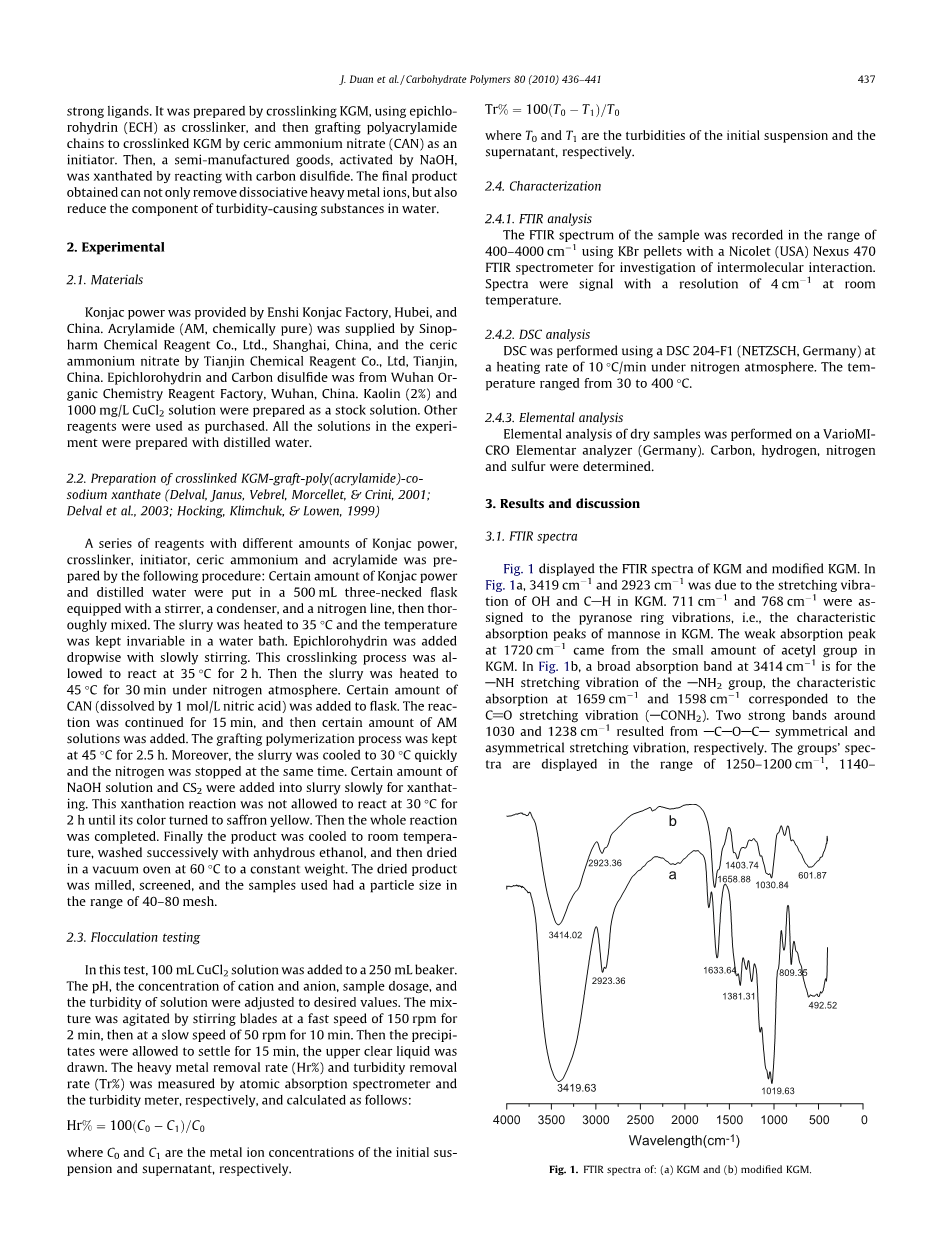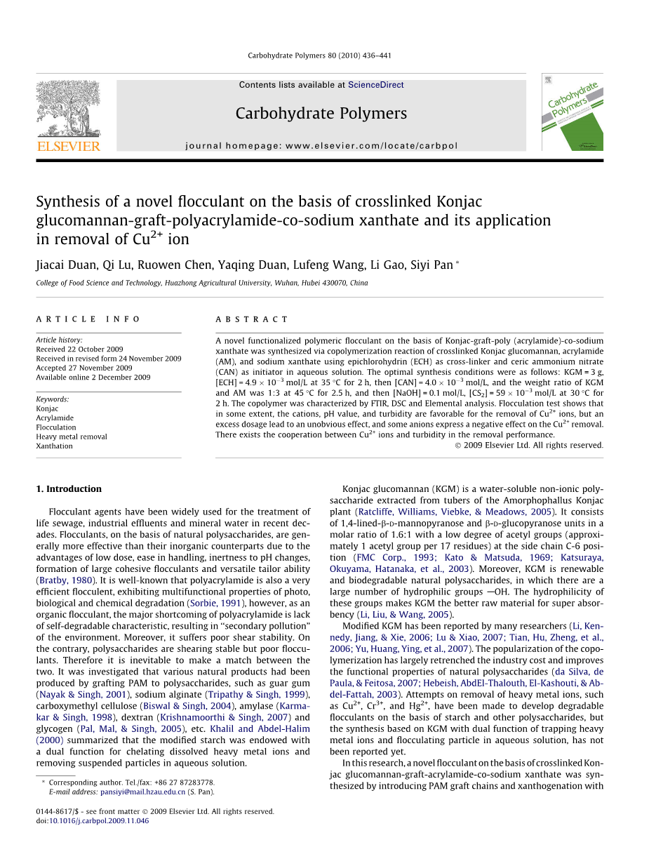 许多研究人员报道了改良的KGM。共聚的普及大大降低了工业成本并且提高了天然多糖的功能特性。在淀粉和其它多糖的基础上开发可降解的絮凝剂从而尝试去除重金属离子如Cu2 ,Cr3 和Hg2 ,但是基于具有双重功能的KGM合成尚未有报道。
