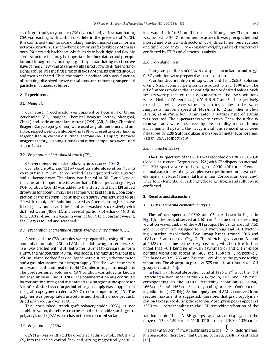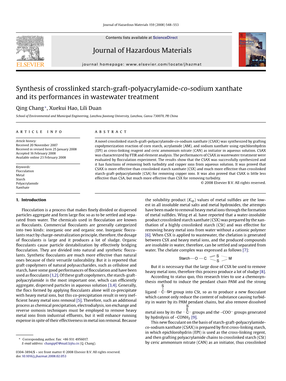 絮凝是一种使细分散或分散的颗粒聚集并且形成大的泡沫的过程,以便沉降和与水分离。用于絮凝的化学品被称为絮凝剂。商业化的絮凝剂通常分为两类:无机的一类和有机的一类。无机絮凝剂通过电荷中和原理反应,因此,絮凝剂的用量大,产生大量的污泥。有机絮凝剂通过有效地桥接絮凝引起颗粒的不稳定。它们分为天然和合成的絮凝剂。合成絮凝剂比天然的有效得多因为它们的多功能裁剪。但据报道天然多糖的接枝共聚物,例如纤维素和淀粉,具有一些良好的絮凝性能,已被用作絮凝剂[1,2]。在这些接枝共聚物中,淀粉-接枝-聚丙烯酰胺是最重要的一种,其可以有效地在水溶液中聚集,分散颗粒[3,4]。通常,通过单独施用火焰剂形成的火焰与重金属离子共沉淀,但是这种共沉淀导致重金属离子去除效果很差[5]。因此,必须采用一个附加过程诸如化学沉淀,电渗析,离子交换和反渗透技术来从工业废水中除去重金属离子,但是尽管它们在金属离子去除方面的有效性很高,但它将增加运行费用。因为金属硫化物的溶解度积(Ksp)值在所有不溶性金属盐和金属氢氧化物中是最低的,所以已经尝试通过金属硫化物的形成去除重金属离子。Wing et al。 已报道水不溶性产物交联淀粉黄原酸酯(CSX)是通过高度交联淀粉(CSt)的黄原酸化制备的,并且对于从没有阳离子聚合物的水中去除重金属离子是有效的[6]。当将CSX应用于废水时,在CSX和重金属离子之间产生螯合,并且所产生的化合物不溶于水,因此可以沉降并与水分离。螯合络合物表示如下[7]: