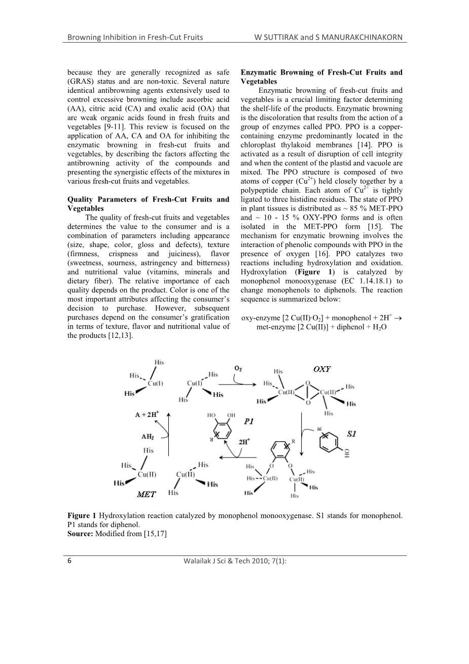 世界各地的食物消费模式正在迅速改变。消费者对食物的选择部分归因于健康问题的增加。因此,水果及蔬菜中营养物质对健康的积极影响已成为消费者主要关注的问题之一。研究已经发现新鲜水果及蔬菜的消费有助于缓解包括癌症、心脏病、关节炎、炎症、免疫系统衰退、脑功能障碍和白内障在内的许多退行性疾病[1-5]。除了健康因素外,消费者的生活方式在消费模式和购买决策中起着重要作用。目前,消费者越对便利食物的需求越来越大,因此,现摘水果及蔬菜正在成为消费者渴望在日常生活中获得更大便利的一个答案。国际现摘农产品协会将现摘产品定义为已经修剪和去皮的水果及蔬菜或切成袋装和预包装的100%可用产品,在保持新鲜度的同时为消费者提供高营养,方便和风味[6]。然而,现摘加工的做法促进了产品更快的生理恶化,生物化学变化,酶活性和微生物降解。这些具有伤害反应的变化已经被证明是造成现摘水果及蔬菜的审美和营养品质以及市场价值损失的主要因素[7]。现摘水果及蔬菜的切面褐变是影响消费者对产品可接受性的最基本因素之一。其中大部分是由多酚氧化酶(PPO)对切割过程中释放的酚类化合物(称为酶促褐变)的作用引起的[8]。酶促褐变可以通过各种方法来控制。应用抗褐变剂是阻止现摘水果及蔬菜中酶促褐变的常用方法。将现摘产品浸渍在适当的防皱剂中进行表面处理可以有效地帮助延缓变色。天然的抗褐变剂是最受欢迎的,因为它们通常被认为是安全的且无毒的。几种性质相同的抗褐变剂广泛用于控制过度褐变,包括抗坏血酸(AA)、柠檬酸(CA)和草酸(OA),它们是在新鲜水果及蔬菜中发现的弱有机酸[9-11]。本文以综述AA、CA和OA在抑制现摘水果及蔬菜中酶促褐变的应用,通过描述影响化合物抗褐变活性的因素,并呈现各种现摘水果及蔬菜混合物的协同的效应。