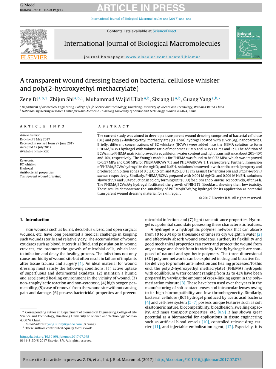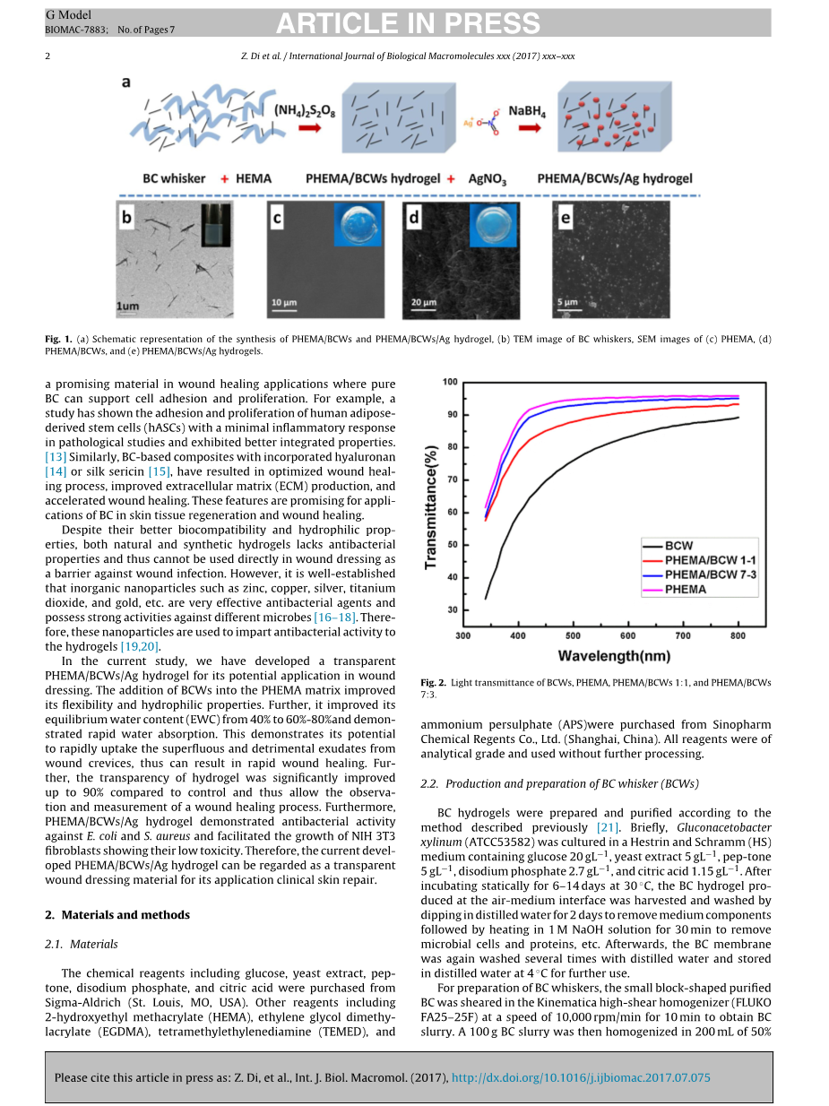 关键词:BC 晶须 ,水凝胶,抗菌性能,透明伤口敷料