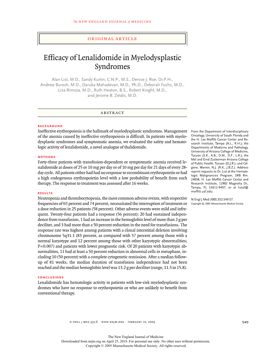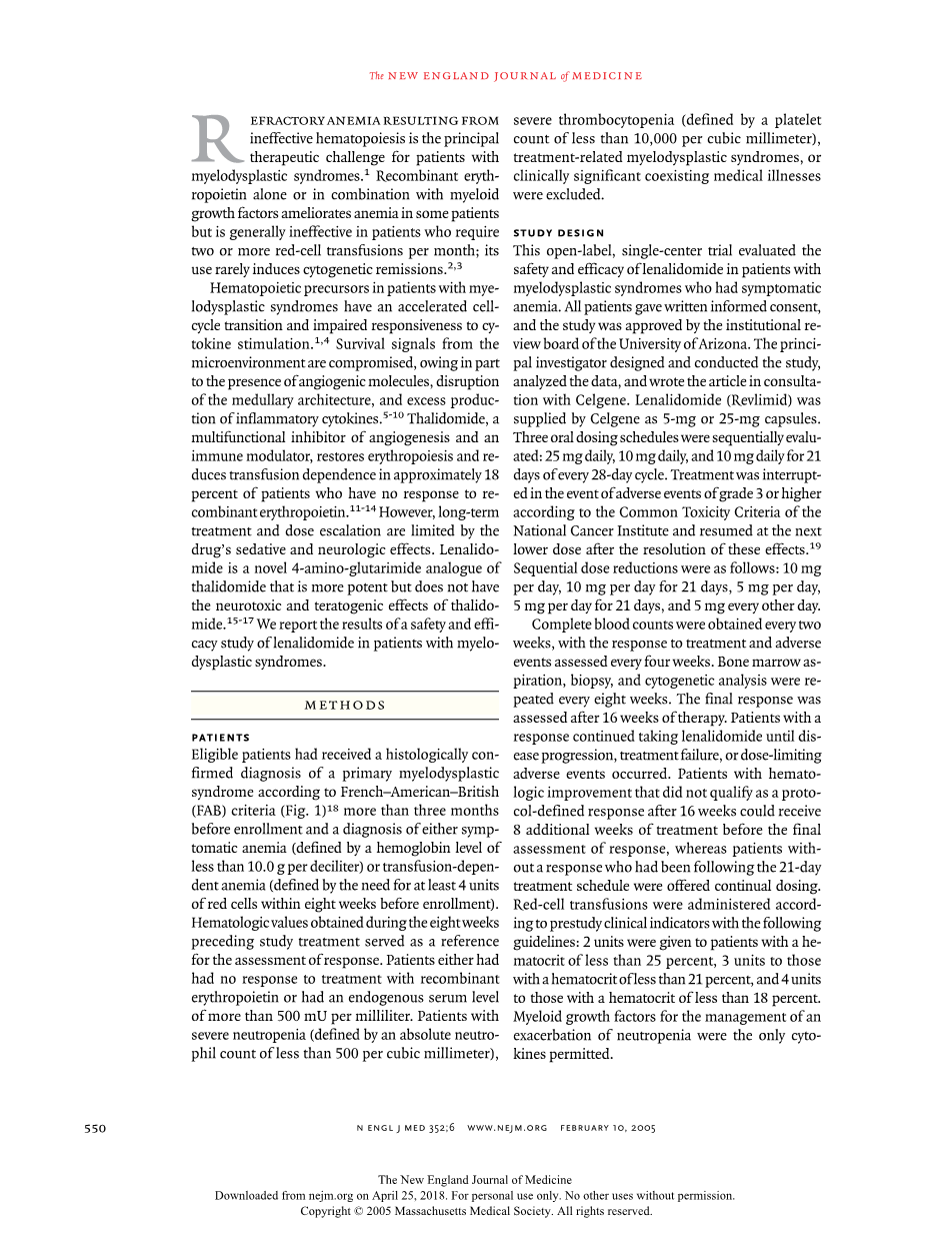 这一开放标签的中心试验评估了利那度胺治疗有症状性贫血的骨髓增生异常综合征患者的安全性和有效性。所有患者均给予书面知情同意。 这项研究得到了亚利桑那大学机构审查委员会的批准。主要研究者设计并进行了研究,分析了数据,并撰写了文章。 利那利度胺(Revlimid)由Celgene提供5 mg或25 mg胶囊.连续评价三种口服给药方案:每日25毫克,每日10毫克,每日10毫克。 或每28天周期21天。根据国家癌症研究所的共同毒性标准,如果发生三级或更高级别的不良事件,治疗就中断,并恢复治疗。 第二次低剂量后,这些效果。19次剂量减少如下:每天10毫克,每天10毫克,21天,5毫克/天,5毫克/天,21天。 前几天。每两周进行一次全血计数,每四周评估一次对治疗的反应和不良事件。骨髓抽吸、活检和细胞遗传学分析每八周重复一次。治疗16周后评估最终反应。有反应的病人继续服用利那度胺,直到疾病进展,治疗失败。 限制不良事件的发生。血液学改善的患者在16周后不符合协议规定的疗效,可接受8周的额外治疗。 对疗效的评估,而没有反应的病人,一直遵循21天的治疗时间表,提供持续的剂量。红细胞输注根据以下指导原则对临床指标进行预研究:对红细胞压积小于25%的患者给予2个单位,对小于21%的患者给予3个单位,以及 红细胞压积小于18%者4个单位。髓系生长因子治疗中性粒细胞减少是唯一允许的细胞因子。