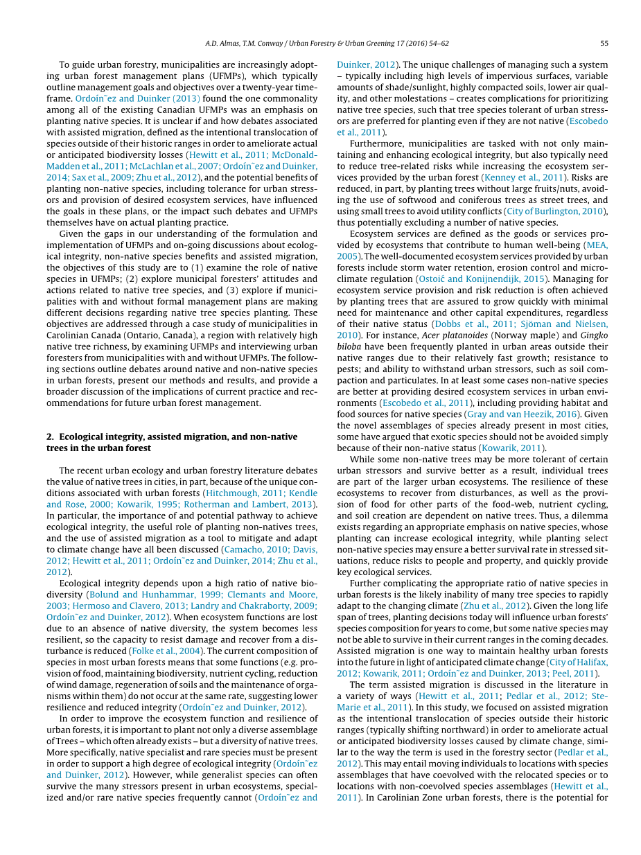 最近的城市生态学和城市林业文献对城市原生树木的价值进行了辩论,部分原因是由于城市森林的独特条件(Hitchmough,2011; Kendle和Rose,2000; Kowarik,1995; Rotherman和Lambert, 2013)。尤其是,已经讨论了实现生态完整性的重要性和潜在途径,种植非本地树木的有益作用,以及使用协助移徙作为缓解和适应气候变化的工具等问题(Camacho,2010; Davis ,2012; Hewitt等,2011;Ordoı#39;n~ez和Duinker,2014; Zhu等,2012)。