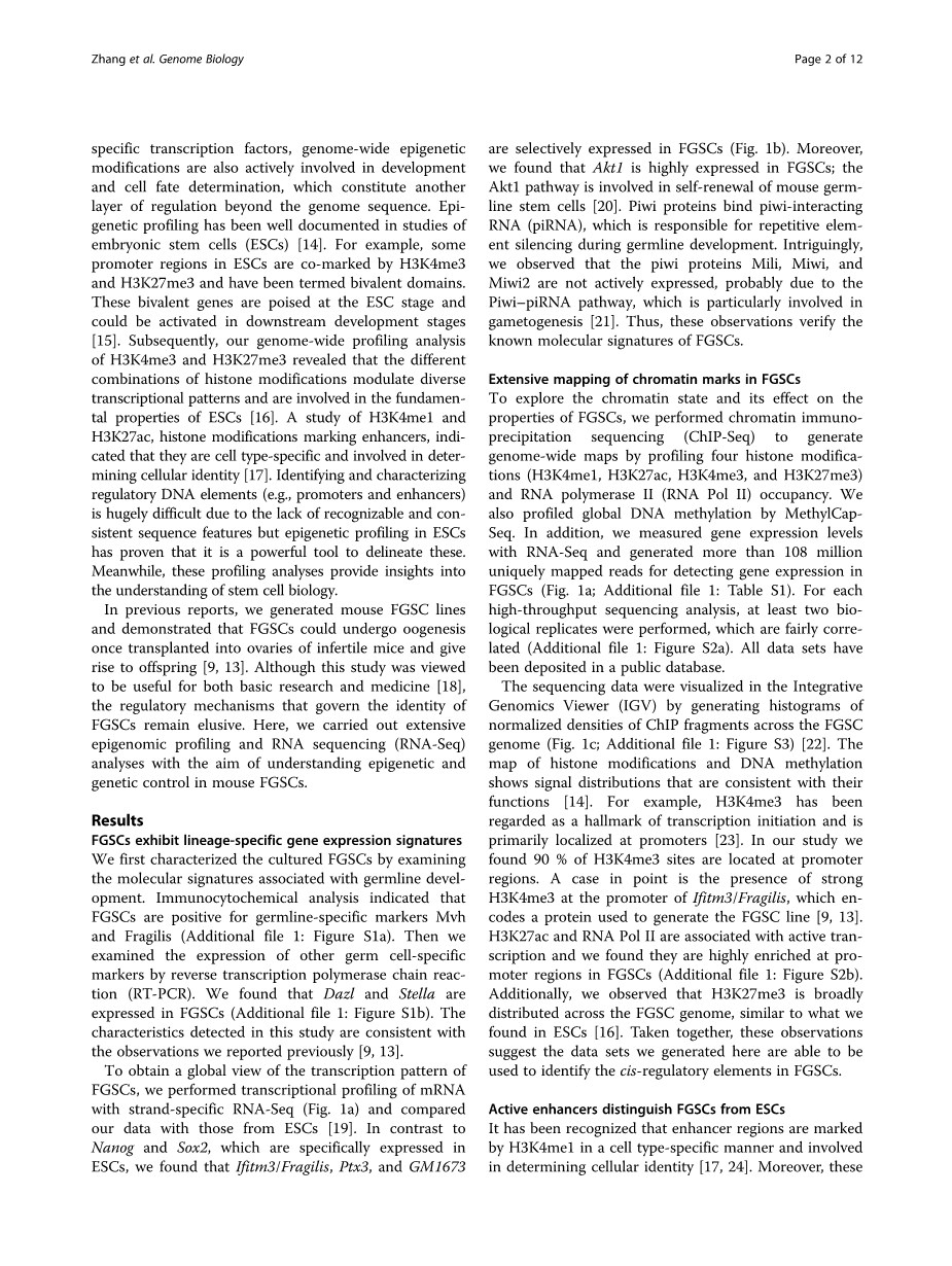 为了全面了解FGSCs的转录模式,我们用链特异性RNA-Seq进行了mRNA转录谱分析(图1a),并将我们的数据与来自ESC的数据进行了比较。与ESCs特异性表达Nanog和Sox2不同的是,我们发现Ifitm3 / Fragilis,Ptx3和GM1673在FGSCs中特异性表达(图1b)。此外,我们发现Akt1在FGSCs中高表达(Akt1通路参与小鼠生殖干细胞的自我更新过程)。 Piwi蛋白与piwi互作的RNA(piRNA)相结合,实现生殖系统发育期间重复元件的沉默。有趣的是,我们观察到piwi蛋白Mili,Miwi和Miwi2没有活跃表达,可能是由参与配子生成的Piwi-piRNA通路调节实现的。因此,这些观察证实了FGSCs已知的分子标记。
