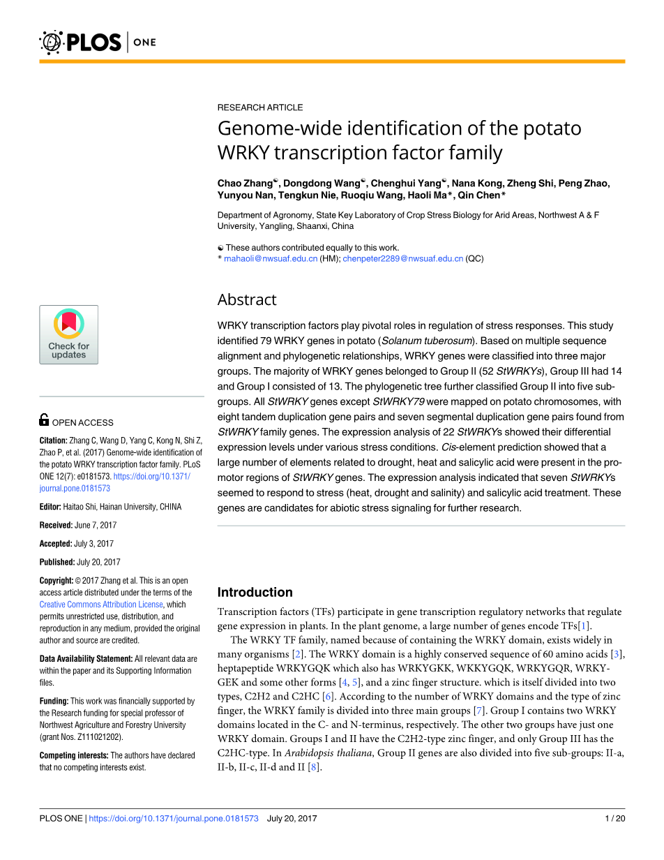 WRKY转录因子在调控胁迫反应中起关键作用。本研究在马铃薯(Solanum tuberosum)中鉴定了79个WRKY基因。根据多序列比对和系统发育关系,将WRKY基因主要分为三类。 其中,马铃薯中WRKY基因大部分属于第Ⅱ类(52个StWRKY),第Ⅲ类有14个,第Ⅰ类有13个。系统发育树进一步将第Ⅱ类分为五个亚类。除StWRKY79外,所有StWRKY基因均定位于马铃薯​​染色体上,其中8个串联重复基因对和7个来自StWRKY家族基因的节段性重复基因对。 在各种胁迫条件下,22个StWRKYs基因具有表达差异。顺式元件预测显示StWRKY基因启动子区存在大量响应干旱、热和水杨酸元件。基因表达分析显示,7个StWRKY对胁迫(热,干旱和盐度)和水杨酸处理有响应。这些基因可用于进一步研究非生物胁迫信号途径。