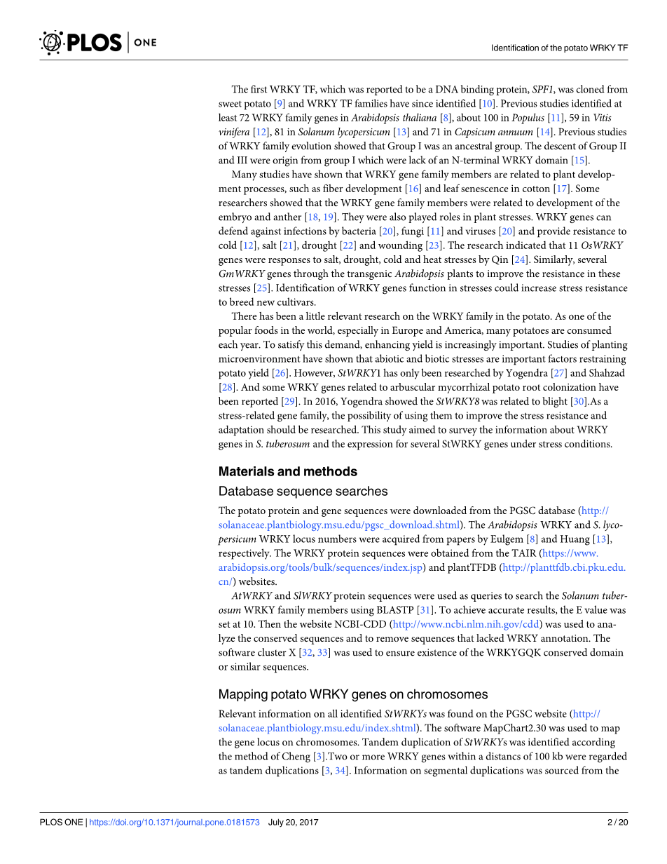 关于马铃薯中WRKY家族的相关研究还很少。作为世界的一种普遍食品,尤其是在欧洲和美国,每年消耗很多马铃薯。为了满足需求,增加产量是非常重要的。植物微环境的研究显示生物和非生物胁迫是限制马铃薯产量的重要因素。然而,StWRKY1只被Yogendra和Shahzad研究过,还有一些与丛枝菌根马铃薯根定植相关的WRKY基因被发现。在2016年,Yogendra发现StWRKY8与枯萎病相关。作为一个胁迫相关的基因家族,应该研究利用它们提高抗逆性和适应性的可能性。这个研究旨在调查S. tuberosumWRKY基因的信息和一些StWRKY基因在胁迫条件下的表达。