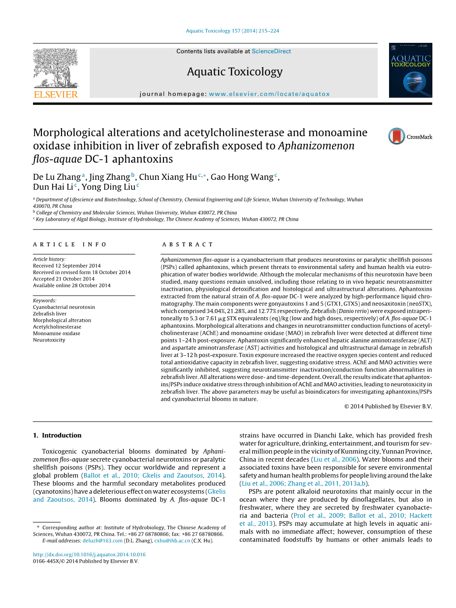 关键词:蓝藻毒素;斑马鱼肝脏;形态改变;乙酰胆碱酯酶;单胺氧化酶;神经毒性
