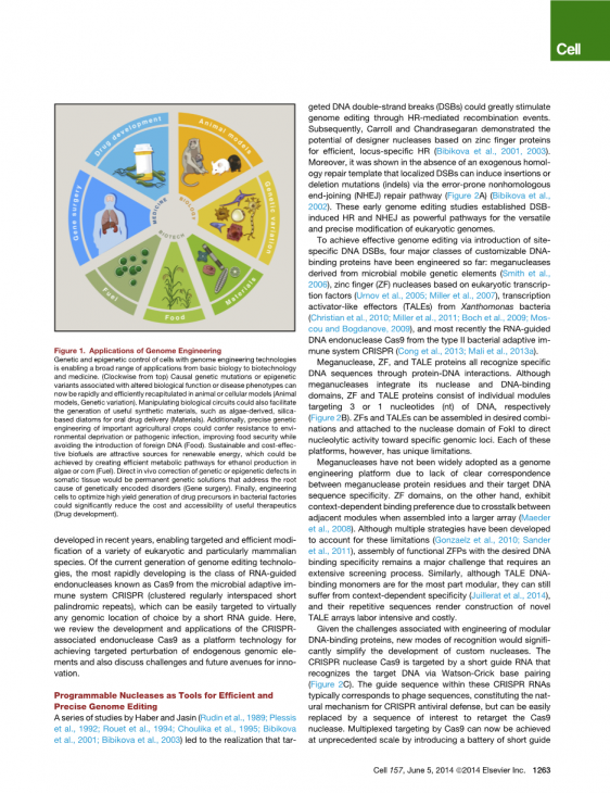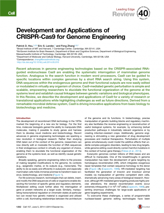 摘要:基于crispr相关RNA引导的核酸内切酶Cas9的基因组工程技术的最新进展使系统地研究哺乳动物基因组功能成为可能。与现代文字处理器的搜索功能类似,Cas9可以通过短RNA搜索串被引导到复杂基因组中的特定位置。利用这个系统,内源性基因组内的DNA序列及其功能输出现在几乎可以在任何生物体中轻松编辑或调节。cas9介导的遗传扰动简单且可扩展,使研究人员能够在系统水平阐明基因组的功能组织,并在遗传变异和生物表型之间建立因果关系。在这篇综述中,我们描述了Cas9在各种研究或翻译应用方面的发展和应用,同时强调了挑战和未来的方向。Cas9源自一个卓越的微生物防御系统,正推动从基础生物学到生物技术和医学的创新应用。