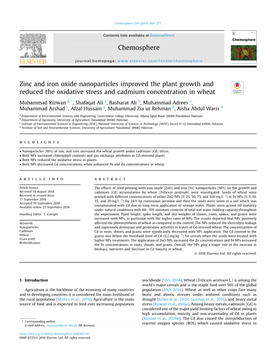 锌和氧化铁纳米粒子改善了小麦植株生长,降低了小麦的氧化应激和镉浓度