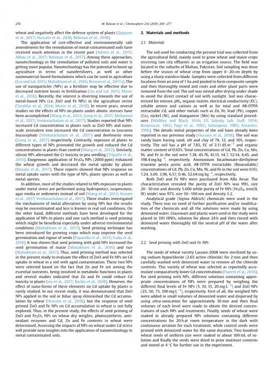 此外,大多数与核动力源暴露于金属胁迫下的植物相关的研究是使用水培、悬浮液、琼脂培养基或沉积物而非土壤进行的(Wang等人,2012年;Konate等人,2017年;Venkathalam等人,2017年)。这些研究调查了使用核动力源减缓金属的机理,但结果可能被高估,在实际土壤条件下了解较少。另一方面,已经开发了不同的方法将核动力源应用于植物,其中一种方法是种子启动,这种方法可能特别有益于不利环境条件(Mahakham等人,2017年)。种植作物采用种子启动技术,可提高种子的发芽率和活力(Paparella等人,2015年;Guha等人,2018年)。结果表明,以金纳米粒为底物的种子提高了玉米(Mahakham et al.,2016)和水稻(Mahakham et al.,2017)的种子发芽率。因此,本研究选择种子启动法来评估氧化锌和铁纳米粒对老化污染土壤中小麦镉吸收的影响。这两种核动力源的选择是基于锌和铁是必需营养素之一,参与植物代谢功能,一些研究表明,锌和铁可以降低植物的镉毒性(Liu等人,2017年;Bashir等人,2018年)。然而,这些元素的纳米形态对植物吸收镉的影响却很少被研究。在我们最近的研究中,证实了ZnO NPs在土壤或叶面喷施中减少了小麦对镉的积累(侯赛因等人,2018),但未充分探索种子引发的ZnO和Fe NPS对小麦镉积累的响应。因此,在本研究中,我们测定了氧化锌和三氧化二铁的种子启动对小麦干重、光合作用、抗氧化酶和镉、锌和铁含量的影响。评估纳米颗粒在镉胁迫下对小麦的影响将为纳米技术在金属污染土壤中的应用提供新的见解。