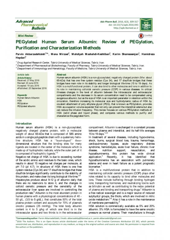聚乙二醇化的人血清白蛋白:聚乙二醇化,纯化和表征方法的综述