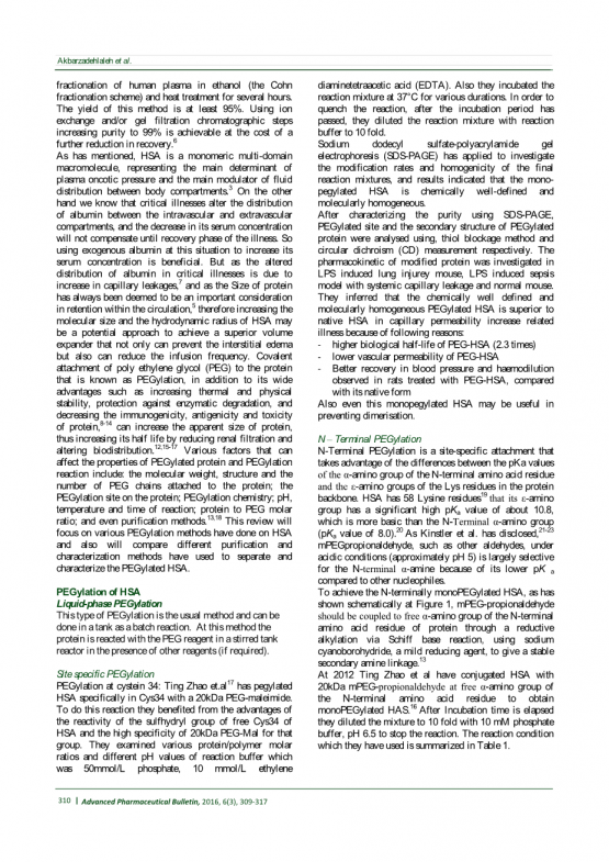 如上所述,HSA是一种单体多结构域大分子,是血浆渗透压的主要决定因素,也是体腔间液体分布的主要调节剂。另一方面,我们知道危重的疾病会改变血管内和血管外腔白蛋白的分布。血清浓度降低,直到疾病的恢复阶段才会得到补充。因此,在这种情况下使用外源白蛋白来增加其血清浓度是有益的。但是白蛋白在危重疾病中的分布变化是由于毛细血管渗漏的增加而导致的,而蛋白质的大小一直被认为是维持其在血液循环的一个重要因素,因此增加HSA分子大小和流体动力学半径可能是获得优质容量扩充剂的潜在方法。这样不仅可以预防间质水肿,还可以降低注射频率。聚乙二醇与蛋白质的共价连接,称为聚乙二醇化。它除具有增加蛋白质热稳定性和物理稳定性,防止酶降解,降低蛋白质的免疫原性,抗原性和毒性等广泛优势以外,也可增加蛋白质的表观大小,从而通过减少肾脏过滤和改变生物分布来延长其半衰期。各种因素可影响聚乙二醇化反应和聚乙二醇化蛋白质的特性,这些因素包括:分子量,结构和与蛋白质连接的聚乙二醇链的数量;蛋白质上的聚乙二醇化位点;聚乙二醇化化学过程;pH,温度和反应时间;蛋白质与聚乙二醇的摩尔比;甚至纯化方法等等。该综述将聚焦各种聚乙二醇化HSA的方法,并且还将比较不同的聚乙二醇化HSA的纯化和表征方法。