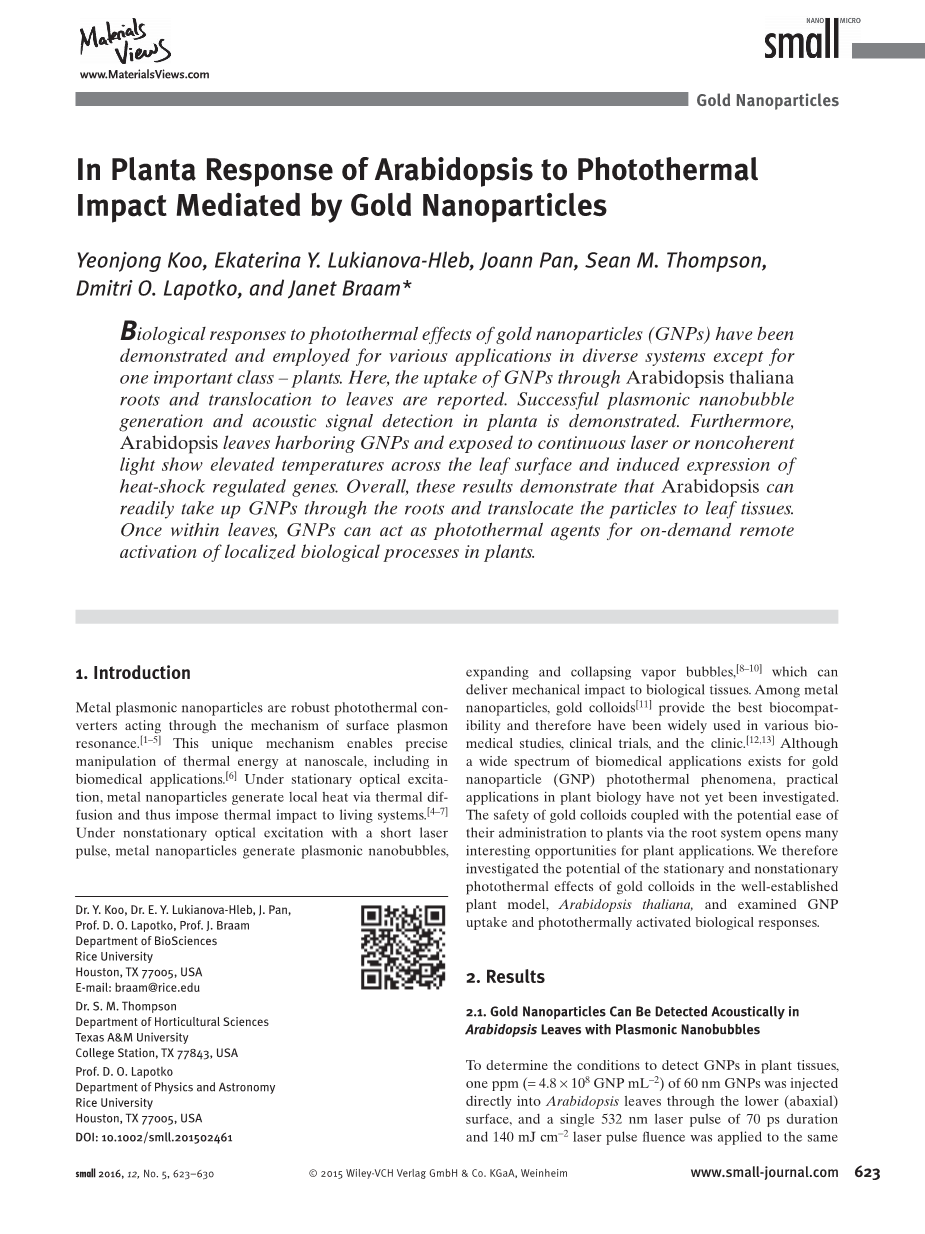 Yeonjong Koo,Ekaterina Y.Lukianova-Hleb,Joann Pan,Sean M.Thompson,Dmitri O.Lapotko,and Janet Braam*