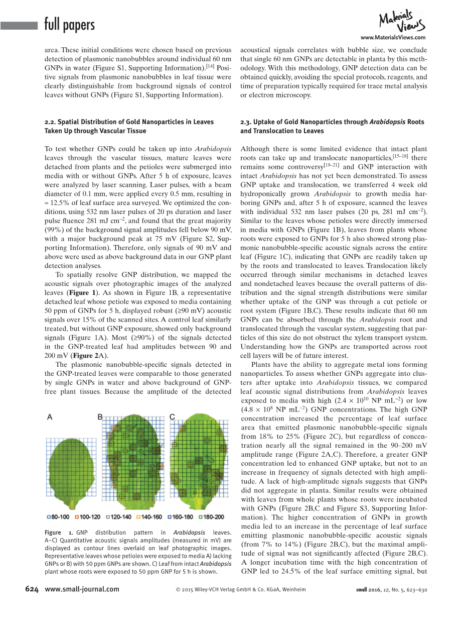 虽然有一些有限的证据表明完整的植物根系可以占据和转移纳米颗粒,但仍然存在一些争议,GNP与完整拟南芥的相互作用尚未得到证实。为了评估GNP摄取和转移,我们将4周龄的水培生长的拟南芥转移到含有GNP的生长培养基上,并且在暴露5小时后,用单独的532nm光(20ps,281mJ cm-2)扫描叶子。类似于叶片直接浸入含有GNP的培养基(图1B)中,GNP暴露5小时的植物叶子,在整个叶片上都显示出强烈的等离子体纳米气泡特异性声信号(图1C),表明GNP是很容易被根吸收并转移到叶上。因为总体分布模式和信号强度分布是相似的,无论GNP的摄取是通过叶或根系(图1B,C)。这些结果表明,60 nm的GNP可以通过拟南芥根系被吸收并通过血管系统移位,这表明这种大小的颗粒不会阻碍木质部输送系统。了解GNP如何通过根细胞层传播将是未来的一个研究方向。