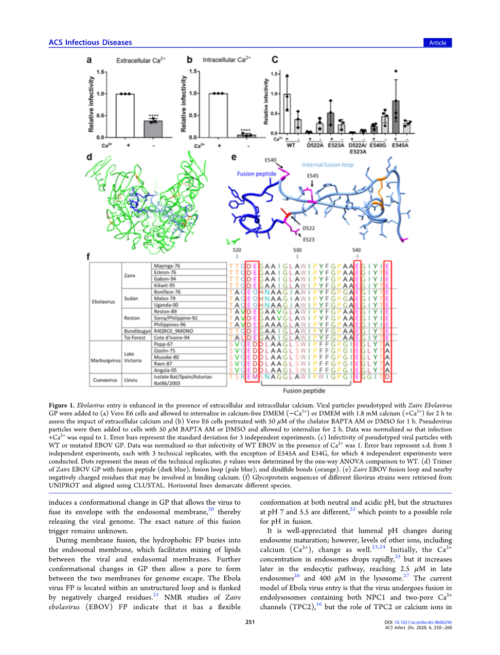 已知Ca2 在一些其他包膜病毒的融合中发挥作用。 风疹病毒依赖于Ca2 使其融合环正确定向。 具体来说,Ca2 与位于E1内相邻融合环上的残基N88和D136协调。 以前,我们表明严重急性呼吸系统综合症冠状病毒(SARS-CoV)的病毒进入是Ca2 依赖性的,并且当存在螯合剂时FP不能诱导膜有序。 (图1e)。结合干扰细胞Ca2 的药物抑制埃博病毒感染的证据以及TPC2在埃博病毒进入中的意义,这些带负电荷的氨基酸的存在促使我们探索Ca2 是否以类似风疹病毒和SARS冠状病毒的方式通过与FP的直接相互作用在埃博拉病毒融合中起作用。