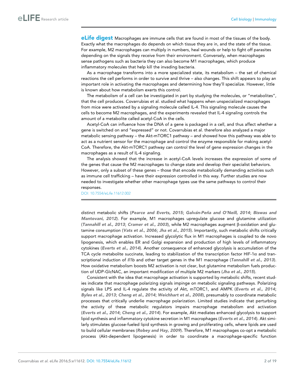 乙酰辅酶A可以影响基因的DNA如何包装在细胞中,从而影响基因是否被打开和“表达”。Covarrubias等。因此,还分析了主要的代谢传感途径--Akt-mTORC1途径 - 并展示了该途径如何能够作为巨噬细胞的营养传感器并控制负责制备乙酰CoA的酶。因此,Akt-mTORC1途径可以控制IL-4信号传导导致的巨噬细胞中基因表达变化的水平。