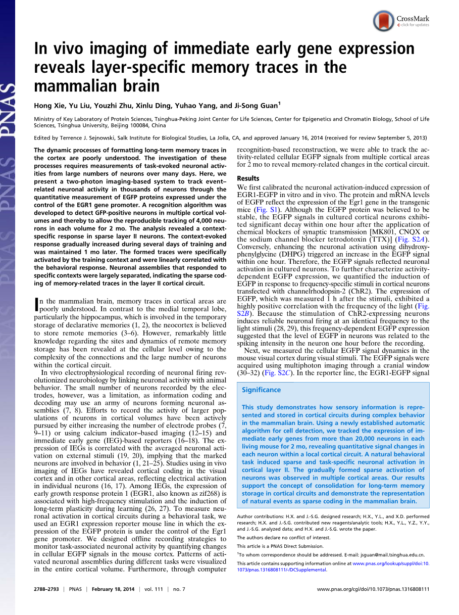 体内早期基因表达即时成像揭示哺乳动物大脑中皮层特异性的记忆印迹