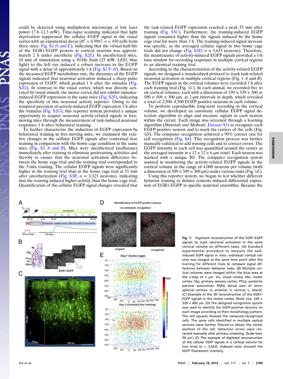 体内神经元放电的电生理记录将神经元活动与动物行为联系起来,彻底改变了神经生物学。然而,电极记录的神经元数量少是一种限制,因为信息的编码和破译需要监测一群神经元形成细胞群[7,8]。为了记录皮层中更大数量的神经元活动,研究人员使用了不同的方法:增加电极数量[7,9-11],使用钙指示剂成像[12-15],即使早期基因(IEG)作为报告基因[16-18]。在外部刺激下,IEGs的表达与平均神经元活动相关[19-20],表明标记的神经元与行为有关[1,21-25]。体内IEGs成像研究揭示了视觉皮层和其他皮层中的编码,反映了单个神经元的电活动[16,17]。在IEGs中,早期生长应答蛋白1(EGR1,也被称为zif268)的表达与高频率的刺激和学习过程中长期可塑性的诱导有关[26,27]。为了监测行为任务中皮层环路的神经元活动,我们使用了一种EGR1表达报告基因的小鼠系,在这一小鼠系中,Egr1基因的启动子能够调控EGFP蛋白表达。通过对小鼠皮层细胞中EGFP信号的变化定量检测,我们设计了离线的(offline)记录策略来监测任务相关神经元的活动。在不同任务中激活的神经元集群模式在整个皮层中可视。此外,通过计算机识别重建,我们能够追踪来自多个皮层区域的与活动相关的细胞EGFP信号2个月,以揭示皮层回路中与记忆相关的变化。