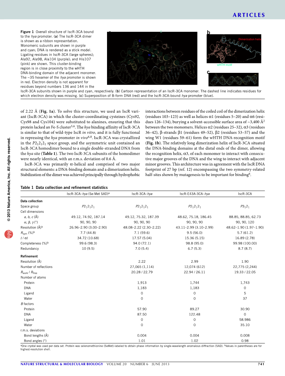 为了评估ISCR-3CA与hya启动子结合时的构象变化,我们还在没有DNA的情况下结晶了ISCR-3CA结构在P3中得到2空间组,并使用扩展到1.9A分辨率的数据确定。与以前的报道一致,IscR在溶液中表现为二聚体,ISCR-3CA不结合DNA结晶为同二聚体。游离和hya结合的ISCR-3CA的类似寡聚状态表明,ISCRDNA结合的调控不同于FNR家族的Fe-S转录因子,其中簇诱导的二聚通常控制DNA结合,比较了ISCR-3CA在和DNA结合的形式表明,未结合的ISCR-3CA具有与ISCR-3CA-hya相同的一般结构。二聚体的两个亚基是相对于彼此旋转20°,导致DNA识别螺旋将其定位在主槽中。除了Glu43,它在绑定时旋转,允许它接触C7C8和C7a8只有轻微的旋转位移是必要的,以适应ISCR-3CA与HYA启动子的结合。一般来说,ISCR-3CA翼的残基在DNA结合时几乎没有发生结构变化,只是Arg59的侧链没有明显的电子密度结构,在与Hya的结合后被指挥。参与DNA相互作用的残基结构中IscR-3CA侧链接触的核苷酸碱基与先前被认为对HYA位点突变分析具有重要意义的碱基很好地对应。然而,由于ISCR结合亲和力的降低,突变的hya位点可能是由于核苷酸接触的去除和(或)核苷酸空间阻碍相互作用。
