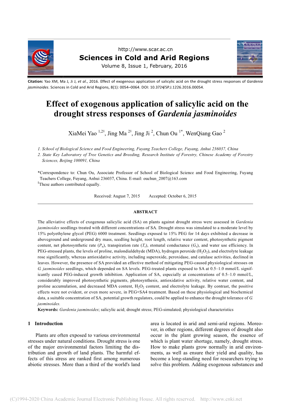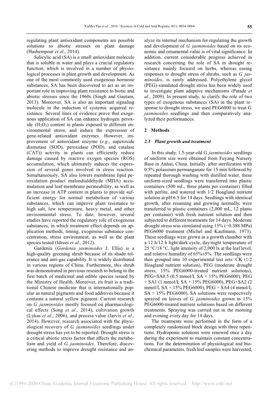 栀子(GardeniajasminoidesJ.Ellis)是一种高品质的绿色灌木,具有良好的耐荫性和抗气性。它广泛分布于中国各地区。此外,以前的研究表明,这种灌木属于卫生部发布的第一批药用和食用树种。此外,它的果实是一种传统中药,作为天然色素和食品添加剂受到国际社会的欢迎,因为它含有天然黄色素。目前对栀子花的研究主要集中在药理作用上(Song等人,2014),种植生长(Lykas等人,2006)和程序价值(Jarvis等人,2014)。然而,与干旱胁迫下栀子幼苗生理恢复有关的研究尚未见报道。干旱胁迫是影响栀子属植物消化及代谢和产量的重要非生物胁迫因子。因此,根据栀子的经济价值和观赏价值,找出提高抗旱性的途径,并分析其调控生长发育的内在机制,具有重要的意义。此外,目前在抗旱研究方面取得了相当大的进展,主要集中在草本植物上,而缓解灌木(如栀子属)干旱胁迫的反应却很少得到解决。聚乙二醇(PEG)模拟干旱胁迫已被广泛用于研究植物的适应性机制(Patade,2009)。为了阐明两种外源物质(SA)在植物抗旱反应中的作用,我们用PEG6000处理了栀子幼苗,并对它们的表现进行了比较分析。