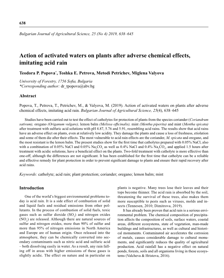 关键词 阴极电解液;酸雨;植物保护;牛至;薄荷