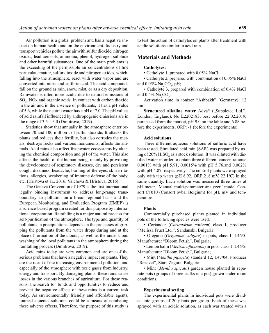 今天的酸雨很常见,是对植物产生负面影响的严重问题之一。它们是日益严重的环境污染的结果,特别是来自工业、能源和运输的有毒气体对大气的污染。由于破坏了植物,这些降雨给农业的各个部门造成了损失。由于这些原因,寻找资金和机会来减少和防止这些降雨的消极影响是目前的一项任务。作为一种对环境友好和价格低廉的试剂,电离水溶液可以作为一种对抗这些不利影响的手段。因此,本研究的目的是测定植物经类似酸雨的酸性溶液处理后对植物的作用。