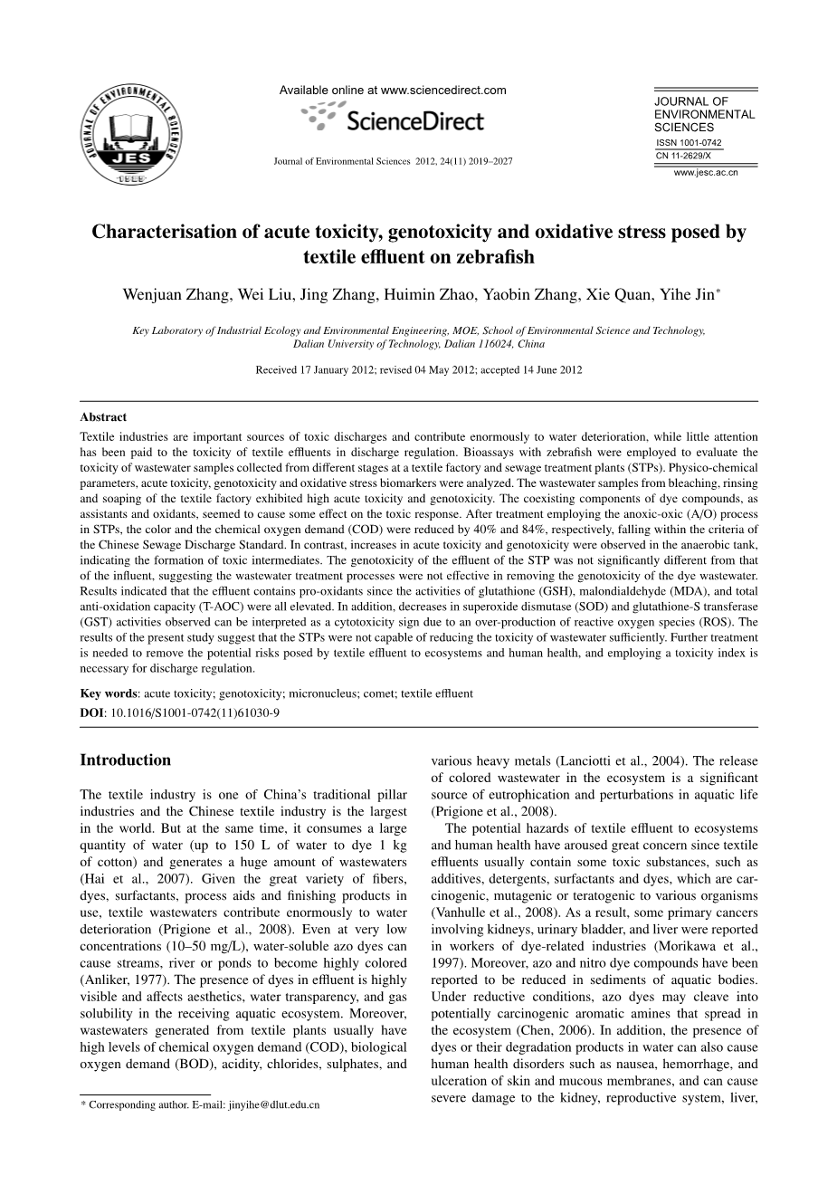 纺织废水对斑马鱼造成的急性中毒、基因中毒和氧化应激的描述