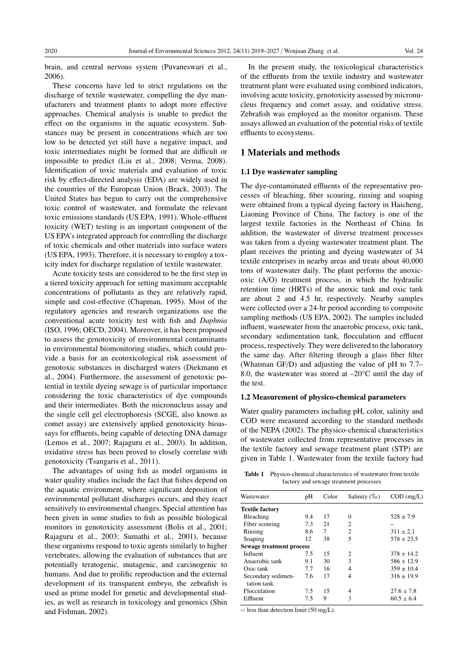 在目前的研究中,从纺织业和污水处理厂均采用综合指标评价毒理特性,包括急性毒性试验、小鼠核的频率和彗星试验评价遗传毒性和氧化应激。斑马鱼作为监测生物体。这些方法对水生态系统提出潜在的风险评价。
