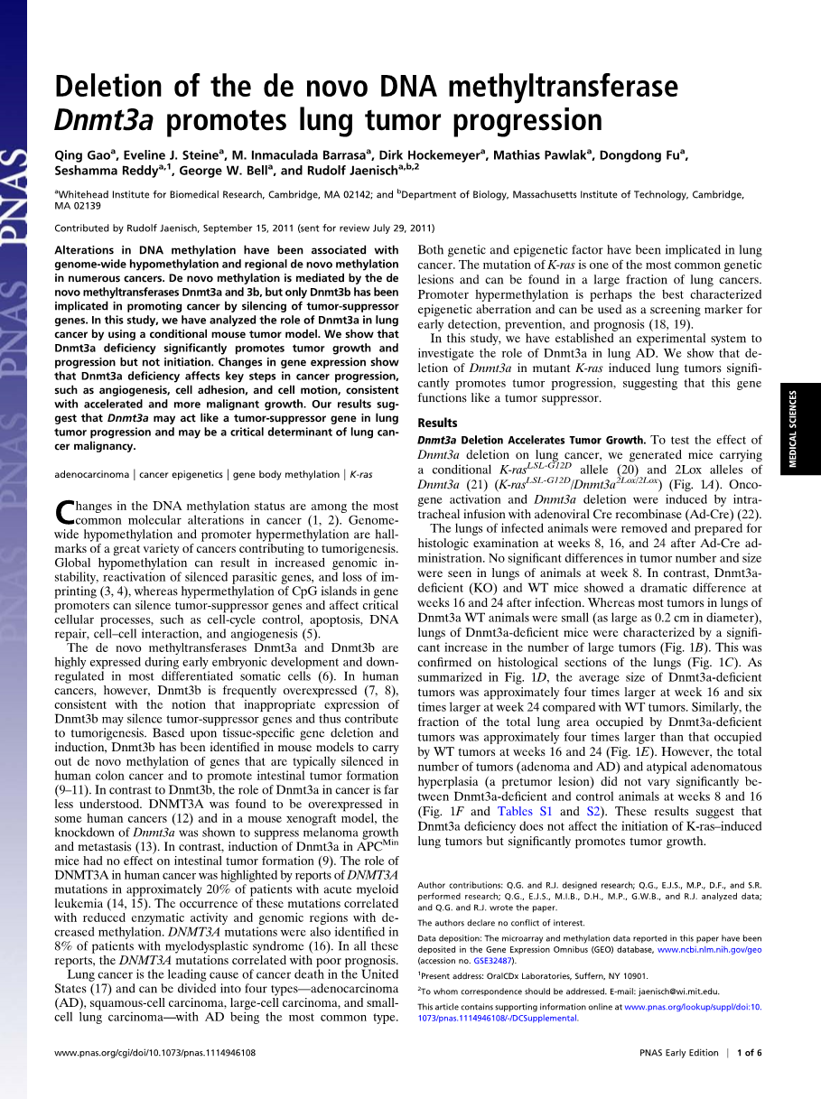 在这篇研究当中,我们建立了一个实验系统,来调查肺腺癌中的DNMT3A所扮演的角色,我们发现 ,DNMT3A在原癌基因突变中的缺失诱发了肺癌细胞显著地发展,表明这个基因功能像是一个抑癌基因。