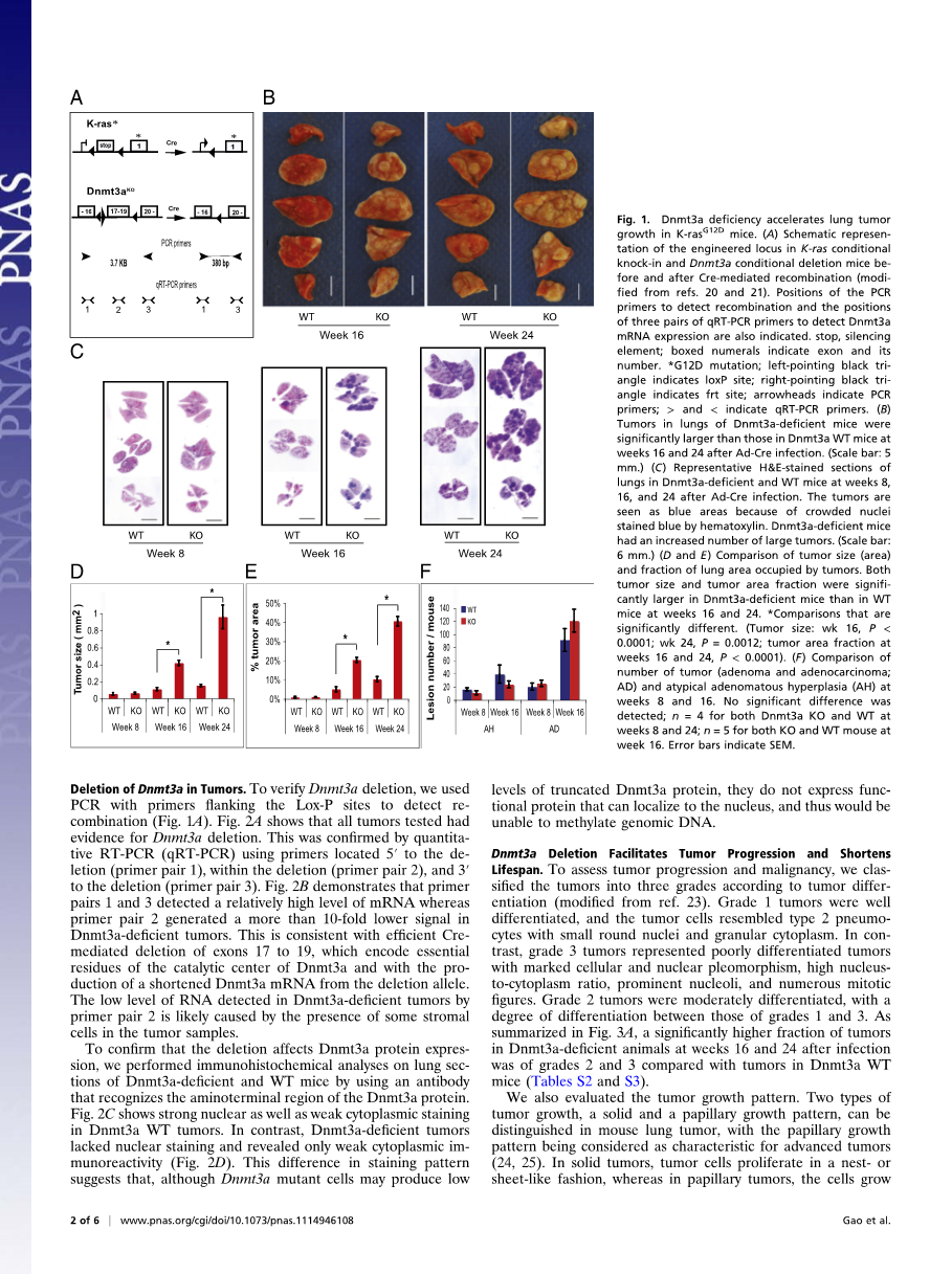 肺部感染的动物在灌入腺病毒Cre重组酶以后被隔离并且分别在8周,16周,24周后准备肺部组织检查,感染动物们的肺部肿瘤数量和型号在第八周时并没有显著差异,相比较起来的DNMT3A缺乏的小鼠和野生型小鼠在感染后的16周和24周出现了显著地差异。然后大多数含有DNMT3A的野生型小鼠肺部肿瘤依然很小(直径约0.2cm),缺乏DNMT3A的小鼠肺部大块肿瘤的数量明显上升,这由组织切片所证实。由图D可知, DNMT3A缺陷的小鼠肿瘤与含DNMT3A的野生型小鼠肿瘤在16周,24周时相对比,前者肿瘤平均大小大约分别为为后者的4倍和6倍,相似地,前者的肿瘤占肺部面积为后者的4倍(16周,24周相同),然而,肿瘤的总数量(腺瘤和肺腺癌)还有非典型的腺瘤增生(癌症形成前的损害)在两者之中并没有显著的差异(图 1F 和 表 S1 还有 S2).