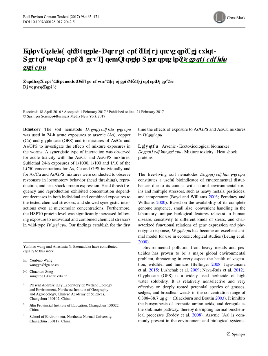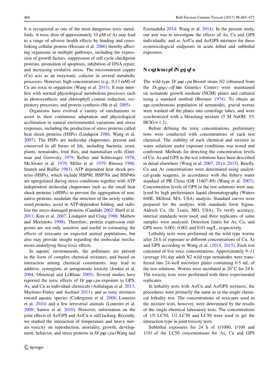 摘要:土壤秀丽线虫在砷、铜和草甘膦以及砷/铜混合物和砷/草甘膦混合物的24小时的急性处理下,研究其混合物对线虫的影响。观察到砷/铜混合物和砷/草甘膦混合物的急性毒性之间具有协同作用。分别对砷、铜和草甘膦以及砷/铜混合物和砷/草甘膦混合物分别进行了24小时的1 / 1000 LC50、1 / 100 LC50和1/10 LC50浓度下半致死实验以观察机体行为的响应(头部抽动)、繁殖情况和热休克蛋白表达变化。头部抽动频率和繁殖在单一或联合实验用的化学应激源处理下浓度依赖性均降低,甚至在微摩尔浓度下也表现出协同作用。此外,野生型秀丽线虫在单独或联合的化学胁迫后HSP70蛋白水平均显著上升。我们的实验结果首次证实了砷/草甘膦混合物和砷/铜混合物对秀丽线虫的影响。