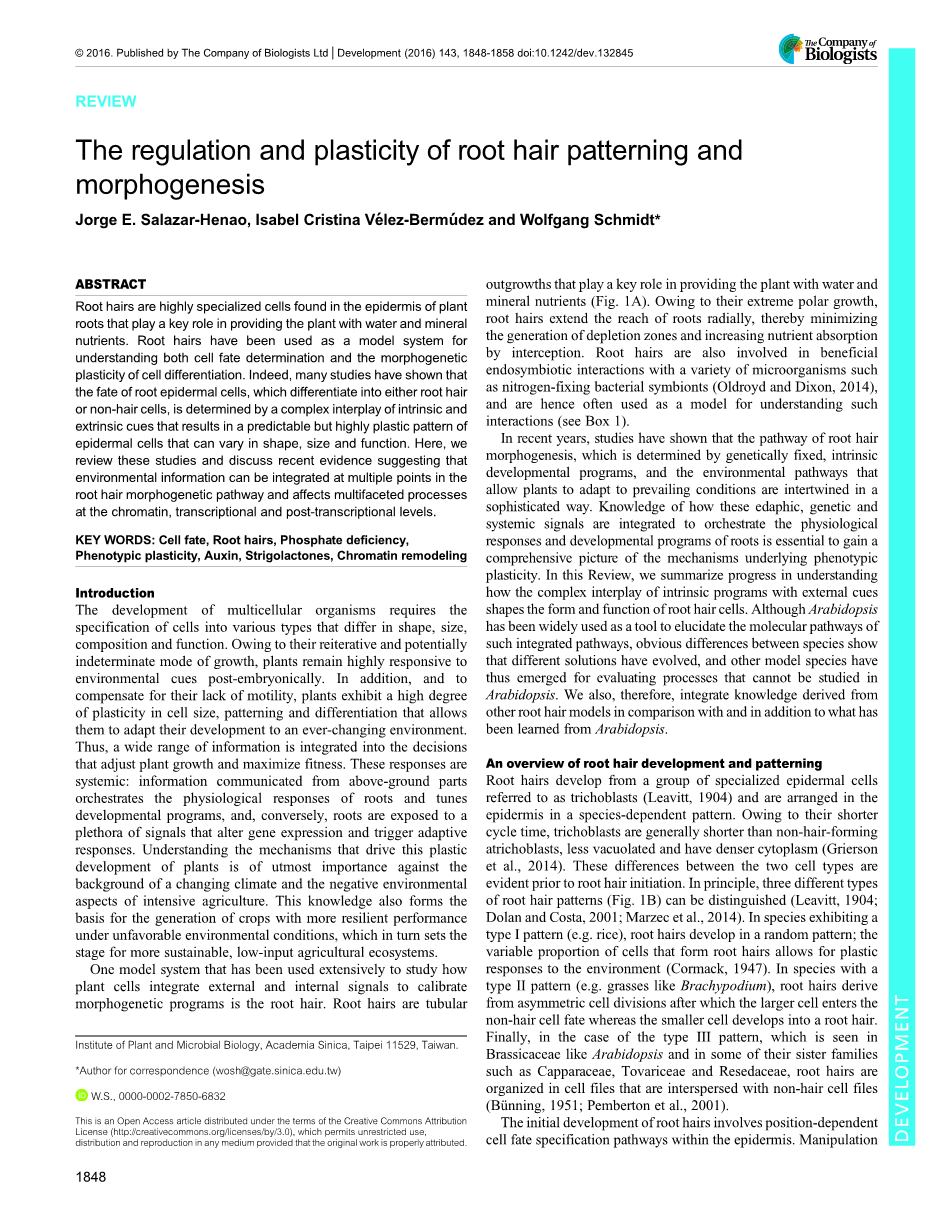 ABSTRACT:Root hairs are highly specialized cells found in the epidermis of plant roots that play a key role in providing the plant with water and mineral nutrients. Root hairs have been used as a model system for understanding both cell fate determination and the morphogenetic plasticity of cell differentiation. Indeed, many studies have shown that the fate of root epidermal cells,which differentiate into either root hair or non-hair cells, is determined by a complex interplay of intrinsic and extrinsic cues that results in a predictable but highly plastic pattern of epidermal cells that can vary in shape, size and function. Here, we review these studies and discuss recent evidence suggesting that environmental information can be integrated at multiple points in the root hair morphogenetic pathway and affects multifaceted processes at the chromatin, transcriptional and post-transcriptional levels.