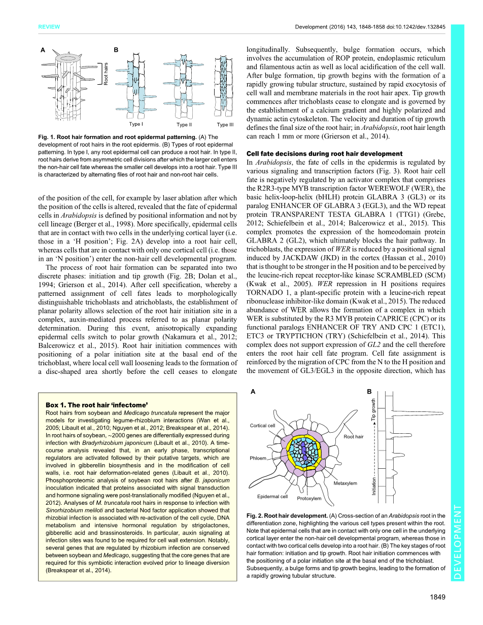 根毛由一组称为毛母细胞的特殊表皮细胞发育而来( 莱维特,1904 ),并以物种依赖的模式排列在表皮中。 由于它们的周期更短,成毛细胞通常比不成毛的哺乳动物更短,液泡化更少,细胞质更致密。这两种细胞类型之间的差异在根毛开始前是显而易见的。原则上,可以区分三种不同类型的根毛图案(图1b)(莱维特,1904年;多兰和科斯塔,2001年;马泽克等人,2014年)。在呈现I型模式的物种中(例如水稻),根毛以随机模式生长;形成根毛的细胞比例可变,允许对环境做出塑性反应( 科马克,1947 )。在具有II型模式的物种中(例如短柄草),根毛来源于不对称的细胞分裂,之后较大的细胞进入非毛细胞命运,而较小的细胞发育成根毛。最后,在III型模式的情况下,这种模式见于十字花科,如拟南芥,以及它们的一些姐妹科,根毛被组织在细胞单元中,细胞单元中散布着非毛细胞单元。