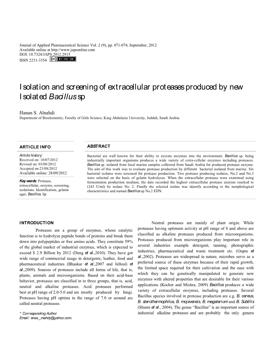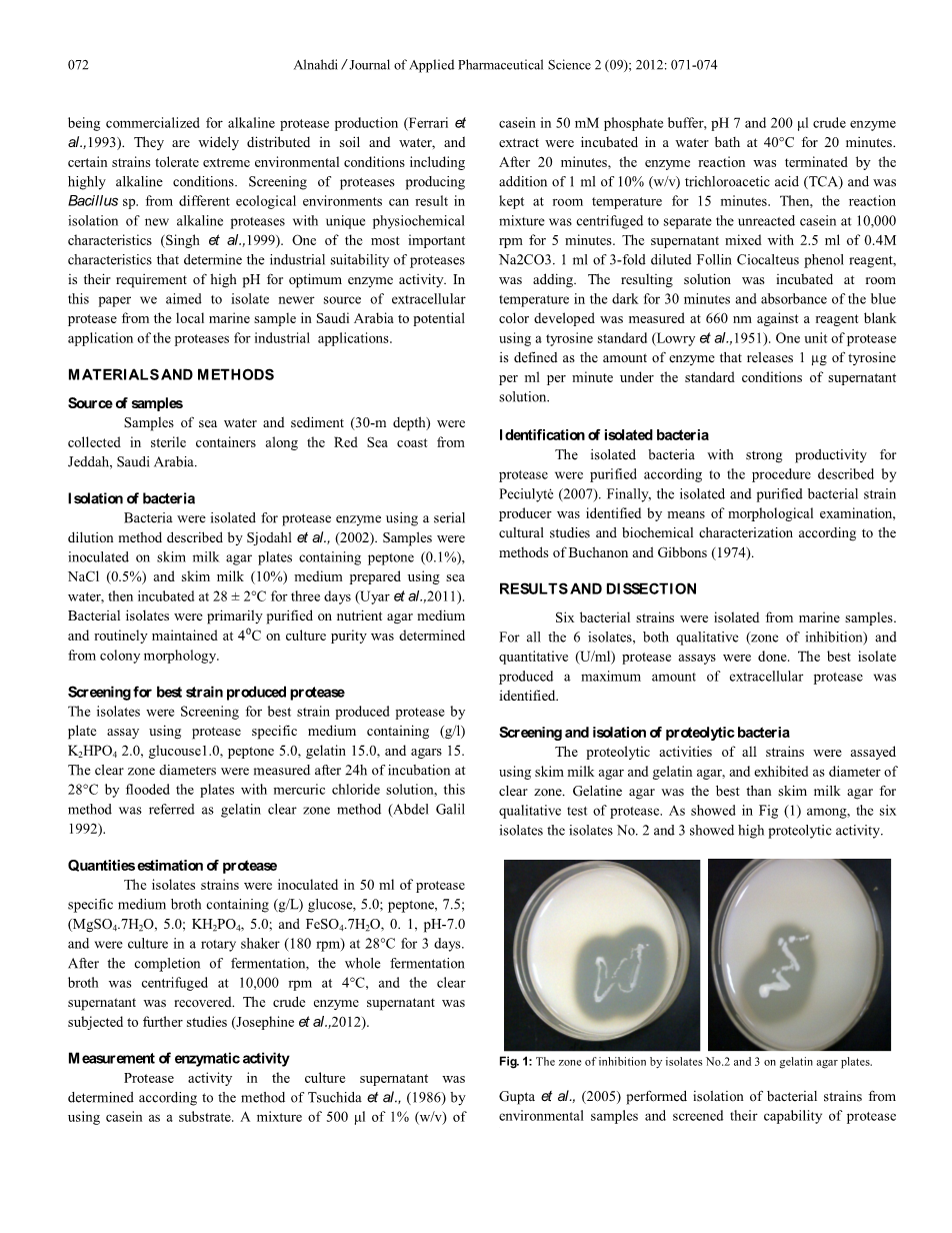 蛋白质是一类酶,它具有催化功能,能够水解蛋白质中的肽键,并将它们分解成多肽或游离氨基酸,占了全球工业酶市场的59%,并有望在2012年超越29亿美元(Deng等人,2010)。他们在洗涤业、皮革业、食品业、医疗工业具有广泛的商业用途(Bhaskar等,2007和Jellouli等人,2009)。蛋白酶的来源包括所有生命形式,即植物、动物、微生物。基于它们的的酸碱特性,蛋白酶分为三种,即酸性、中性和碱性蛋白酶。酸性蛋白酶在pH值2.0 - 5.0范围内活性最高并且主要由真菌产生。而最佳活性在pH值7.0及左右的蛋白酶称为中性蛋白酶,主要来源于植物。而在pH值8.0及以上范围具有最佳活性,由微生物产生的蛋白酶被分类为碱性蛋白酶。由微生物产生的蛋白酶在例如洗涤剂、制革业、摄影行业、制药业和废物处理等许多行业发挥重要作用(Gupta等,2002)。蛋白酶在自然界中广泛存在,微生物凭借其快速生长而成为这些酶的首选来源,它们的培养不需要太多的空间,并且容易通过遗传操作,从而产生特性改变的新酶,这些酶具有各种很好的应用前景(Kocher和Mishra,2009)。芽孢杆菌是一种菌属,它能产生包含蛋白酶在内的多种细胞外酶,例如蜡状芽孢杆菌、嗜热脂肪芽孢杆菌、漠海威芽孢杆菌、巨大芽孢杆菌和枯草芽孢杆菌(Shumi等人.2004)。“芽孢杆菌属”在工业上是碱性蛋白酶的重要来源,并且可能是商业上用于碱性蛋白酶生产的唯一一种菌属(Ferrari等,1993)。它们广泛分布于土壤和水中,某些菌株可耐受包括高碱性在内的极端环境条件。需要高pH值以达到其最佳酶活性则是决定蛋白酶工业适用性的最重要特征之一,从不同生态环境中筛选出能产生蛋白酶的芽孢杆菌,可以分离出具有独特生理化学特征的新碱性蛋白酶(Singh等,1999)。在本文中,我们的目的是从沙特阿拉伯当地的海洋样本中分离出产生蛋白酶的新来源以及探索蛋白酶在工业中的潜在应用。