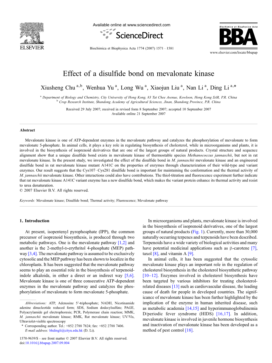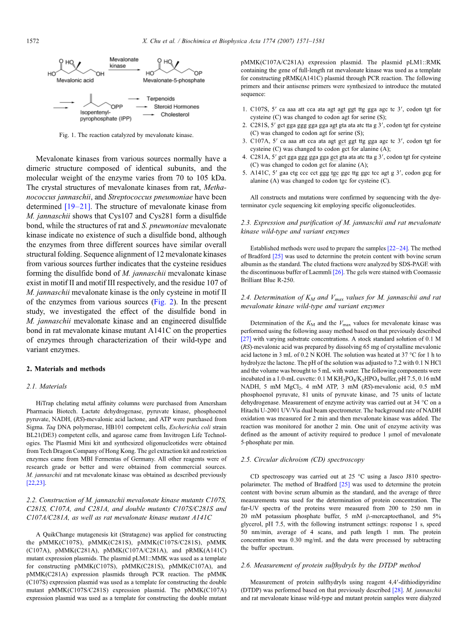 在微生物和植物中,甲羟戊酸激酶参与类异戊二烯衍生物的生物合成,其中有一个最大的天然产物的基团。目前,有3万多天然存在的萜烯和萜类化合物已被描述。萜类化合物具有多种生物活性,应用于许多有潜力的药用,例如beta;胡萝卜素,紫杉醇,和维生素A。在动物细胞中,实验已经表明胞质中甲羟戊酸激酶在胆固醇生物合成途径中,起着重要的调节作用。它参与胆固醇生物合成的酶定位,像各种抑制剂用于治疗胆固醇相关的疾病,例如心血管疾病。甲羟戊酸激酶的意义已经被进一步凸显在人类遗传性疾病的酶的含义,例如免疫学和高免疫球蛋白血症D /周期性发热综合征(HIDS)。此外,甲羟戊酸激酶参与激素生物合成的同时,针对甲羟戊酸激酶失活已发展为一个病虫害防治方法。从各种来源的甲羟戊酸激酶通常由二聚结构相同的亚基组成,酶的分子量而变化,从70到105 kDa。从大鼠的甲羟戊酸激酶的晶体结构来看,詹氏甲烷球菌、肺炎链球菌已确定。虽然来自三个不同来源的酶具有相似的总体结构折叠,M.球菌甲羟戊酸激酶表明Cys107和Cys281形成二硫键,而大鼠和肺炎链球菌甲羟戊酸的结构激酶指示没有存在这样的二硫键。通过甲羟戊酸激酶序列比对,从各种来源进一步表示该半胱氨酸残基形成M的二硫键。M.詹氏甲烷球菌甲羟戊酸激酶存在于主题II和主题III,而残留107M处.球菌甲羟戊酸激酶是主题II的唯一半胱氨酸。我们通过它们的野生型表征的酶和变体酶调查了二硫键的效果。M.球菌甲羟戊酸激酶和二硫键在大鼠甲羟戊酸激酶突变体A141C上发挥作用。