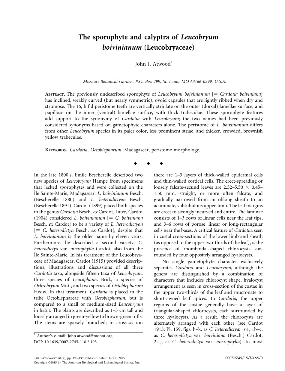摘要:白发藓属{Leucobryum boivinianum [equiv;Cardotia boiviniana]}孢子体有着偏斜、微弯曲(但近对称)的卵球形孢蒴,在干燥时呈浅肋的瘤状,而之前的研究从未提及。16个蒴齿在外(背)表面呈垂直条纹状,在内(腹)表面呈柱状且具有明显横隔。这些孢子体特征为白发藓属Cardotia与白发藓属Leucobryum同为白发藓属提供了证据。而早前仅凭配子体性状就把白发藓属Cardotia与白发藓属Leucobryum当作同义词。与其他白发藓属Leucobryum不同的是,白发藓属L. boivinianum的蒴齿颜色较淡且条纹较不明显,棕黄色横隔更厚且更密集。