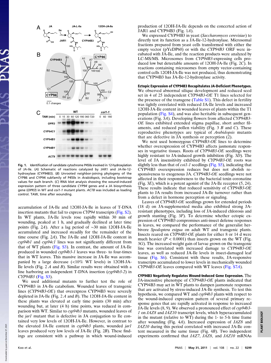 尽管12OH-JAs具有重要的生物学特性且在植物界广泛存在,但与JA和JA- Ile的12-羟基化有关的酶尚未被报道。在这里,我们确定JA-Ile-12-羟化酶是细胞色素P450单加氧酶(P450s)CYP94家族的成员(CYP94B3)。利用遗传、生化和代谢方法进行的功能研究表明,CYP94B3在茉莉酸反应的JA-Ile转换和衰减中发挥作用。因此,这些发现揭示了一种以前未探索的酶,它在茉莉酸代谢和信号转导中发挥关键作用。