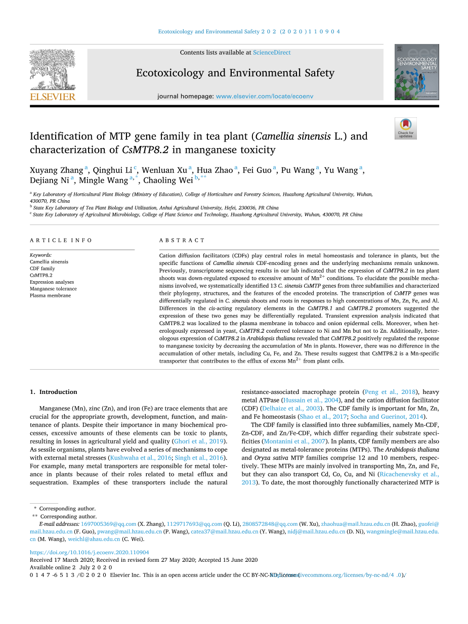 关键词:茶树; CDF家族; CsMTP8.2; 表达量分析; 锰耐受性; 质膜