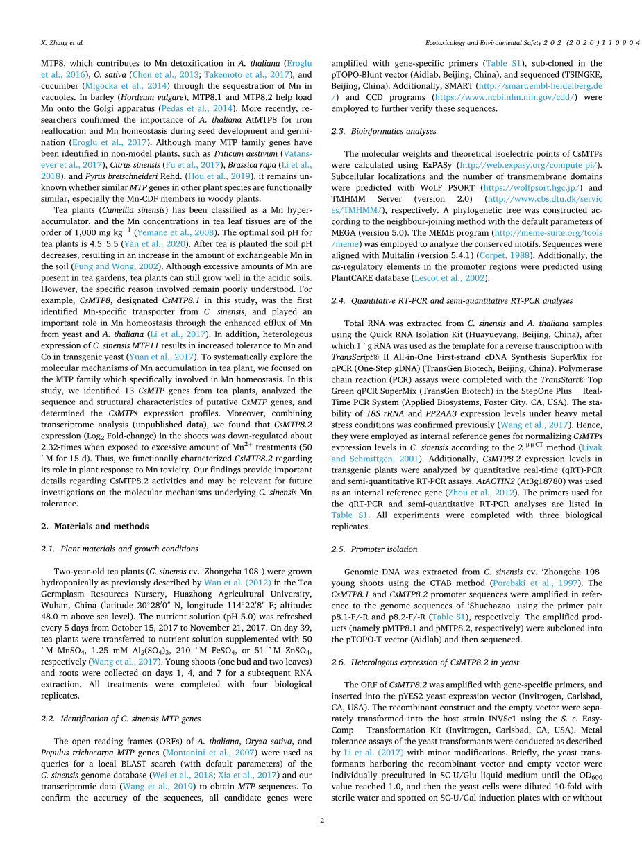茶树(Camellia sinensis L.)被列为锰超积累植物,茶叶组织中的锰浓度为约1000 mg/kg。(Yemane et al., 2008)。茶树的最适土壤pH值为4.5 ~ 5.5(Yan et al., 2020)。种植茶叶后,土壤pH值降低,导致土壤中可交换锰的量增加(Fung and Wong, 2002)。但茶树在Mn过量的酸性土壤中仍能很好地生长,人们对这其中所涉及的具体原因仍知之甚少。例如,CsMTP8,即本研究中的CsMTP8.1,是第一个被确定的Mn特异性转运体编码基因,其编码的蛋白通过增强酵母和拟南芥中的锰的外排,在锰稳态中发挥重要作用(Li et al., 2017)。此外,异源表达CsMTP11增加了转基因酵母对Mn和Co的耐受性(Yuan et al., 2017)。为了系统地探讨茶树中Mn积累的分子机制,本研究重点关注专门参与锰稳态的MTP家族,从茶树中鉴定了13个CsMTP基因,分析了鉴定出的CsMTP基因的序列和结构特征,并确定了CsMTP基因的表达谱。此外,结合转录组分析,本研究还发现过量的Mn2 (50 mu;M/15d)处理后,CsMTP8.2的表达(Log2 Fold-change)下调约2.32倍,因此,本研究对CsMTP8.2在植物对锰毒性反应中的作用进行了功能表征。本研究的结果补充了一些CsMTP8.2分子在植物中起作用的细节,可为今后研究茶树耐锰的分子机制提供参考。