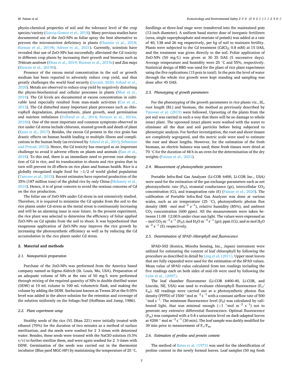 纳米氧化锌通过调节光合作用和抗氧化防御系统缓解镉胁迫对水稻的不利影响外文翻译资料